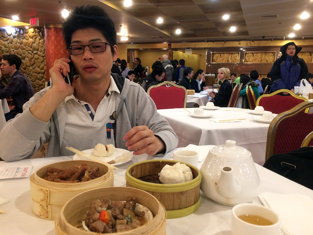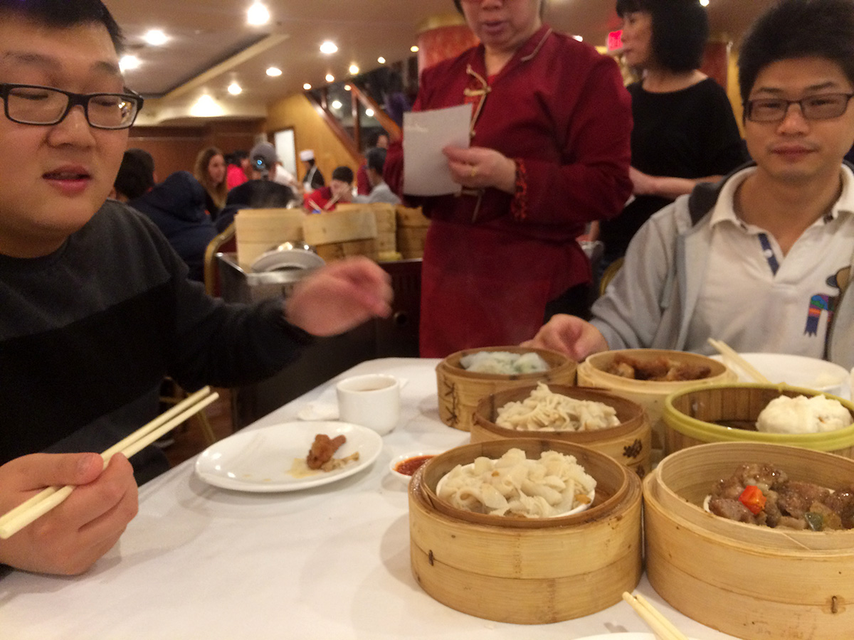we got a table in the windowless basement, which can feel claustrophobic, the heat of so many bodies combined with the heat from the kitchen. unlike last time, we got an aisle table so cart access was easier. we started ordering, li texting his friend to figure out where he was. peter showed up soon afterwards, a chunky chinese guy. originally i assumed they knew each other from their astrophysics studying, but they're actually badminton friends, peter affiliated with harvard medical doing bioinformatics research at dana-farber. i found out he's originally from hunan, but actually more canadian as his family immigrated to vancouver when he was 8 years old. if he never told i would've never guessed, as he seemed whole china chinese, without any hint of american/canadian. he's fluent in chinese, as he was in the 3rd grade when they moved, so he can already read and write (unlike me, where i only managed to pick up bits and pieces over the years).
