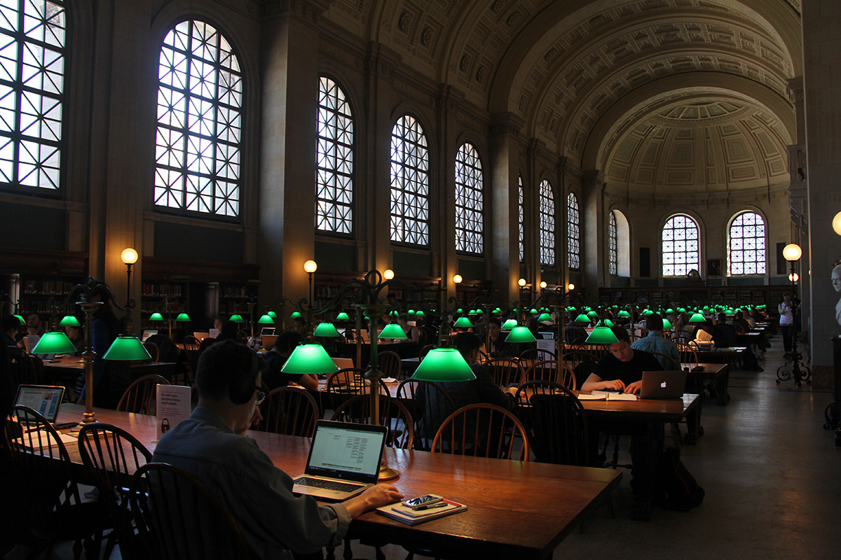 next we went inside the boston public library. i'd taken li here when i gave him a personal tour of boston last september. like li, peter was not impressed when i showed him the reading room. "this looks just like the [harvard university] widener library," he said, "except that one is bigger." peter went home afterwards, he had other social events to go to. he took the green line from copley square. later he called li to tell him he rode the subway in the wrong direction and got lost.