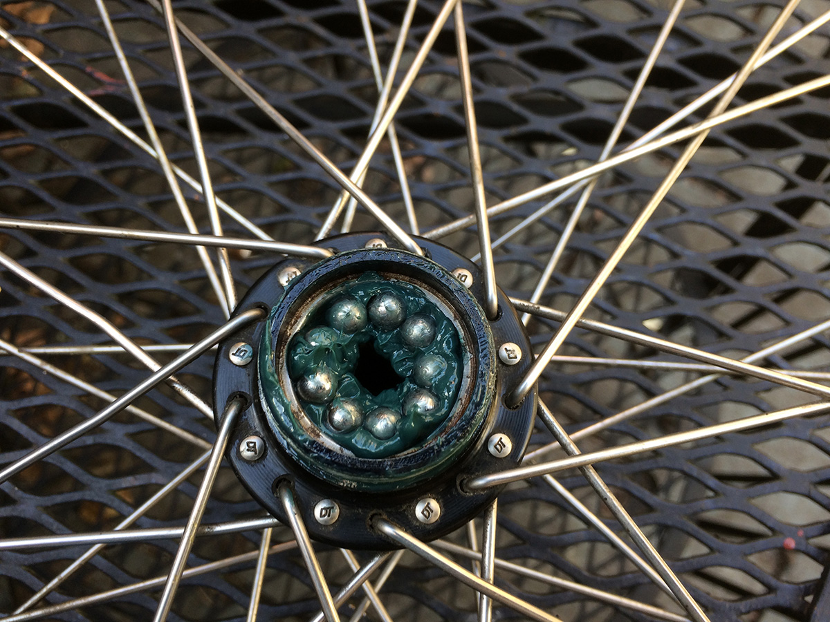 with the hub shells cleaned, it was time to pack in some new ball bearings. after filling the shells with grease, i put 9 ball bearings per side. after that i slide in the new axle and secured it using the cones before adding the spacers and nuts. now that i've rebuilt the axle, it no longer wobbles like it used it, which is great.