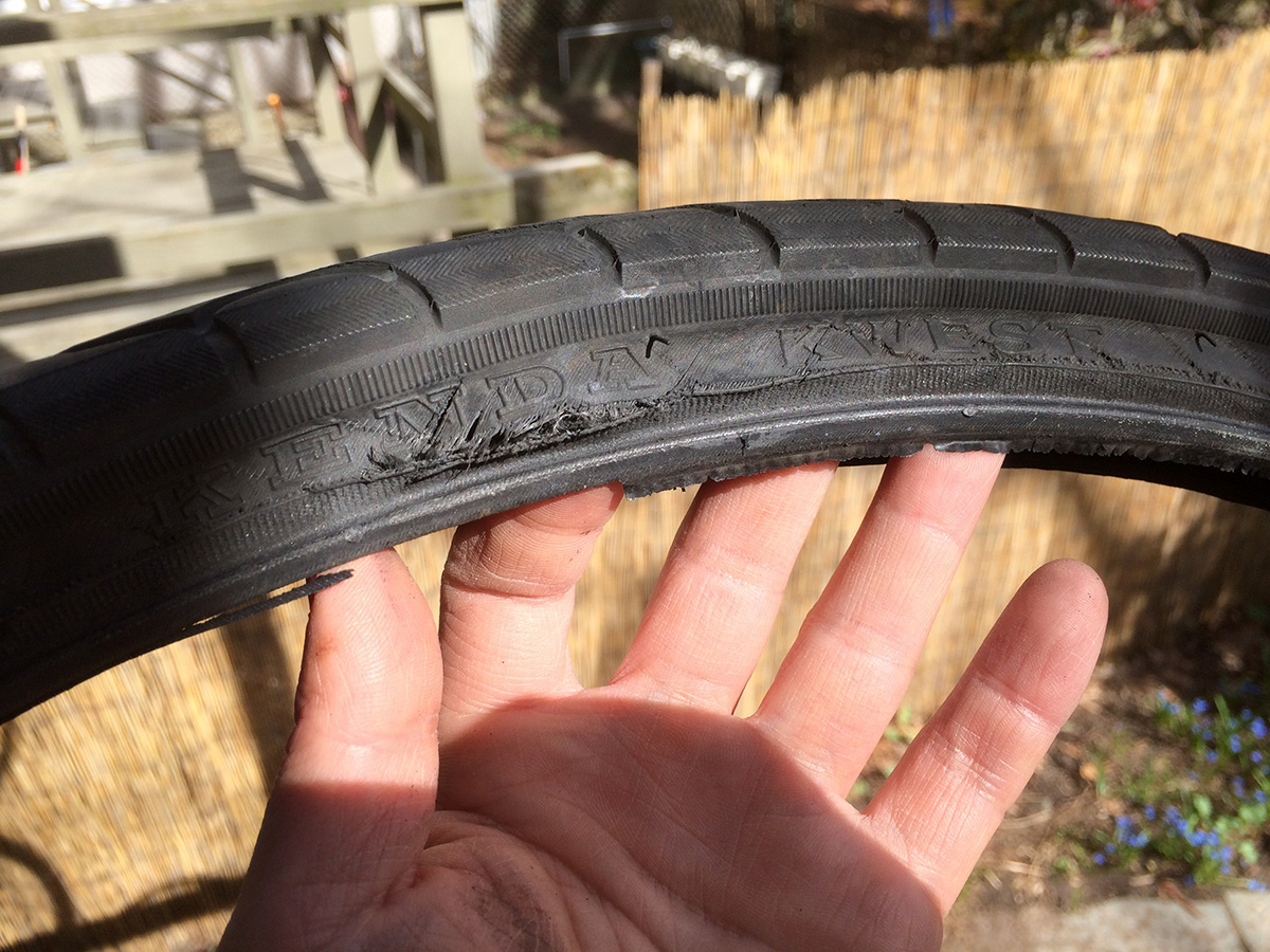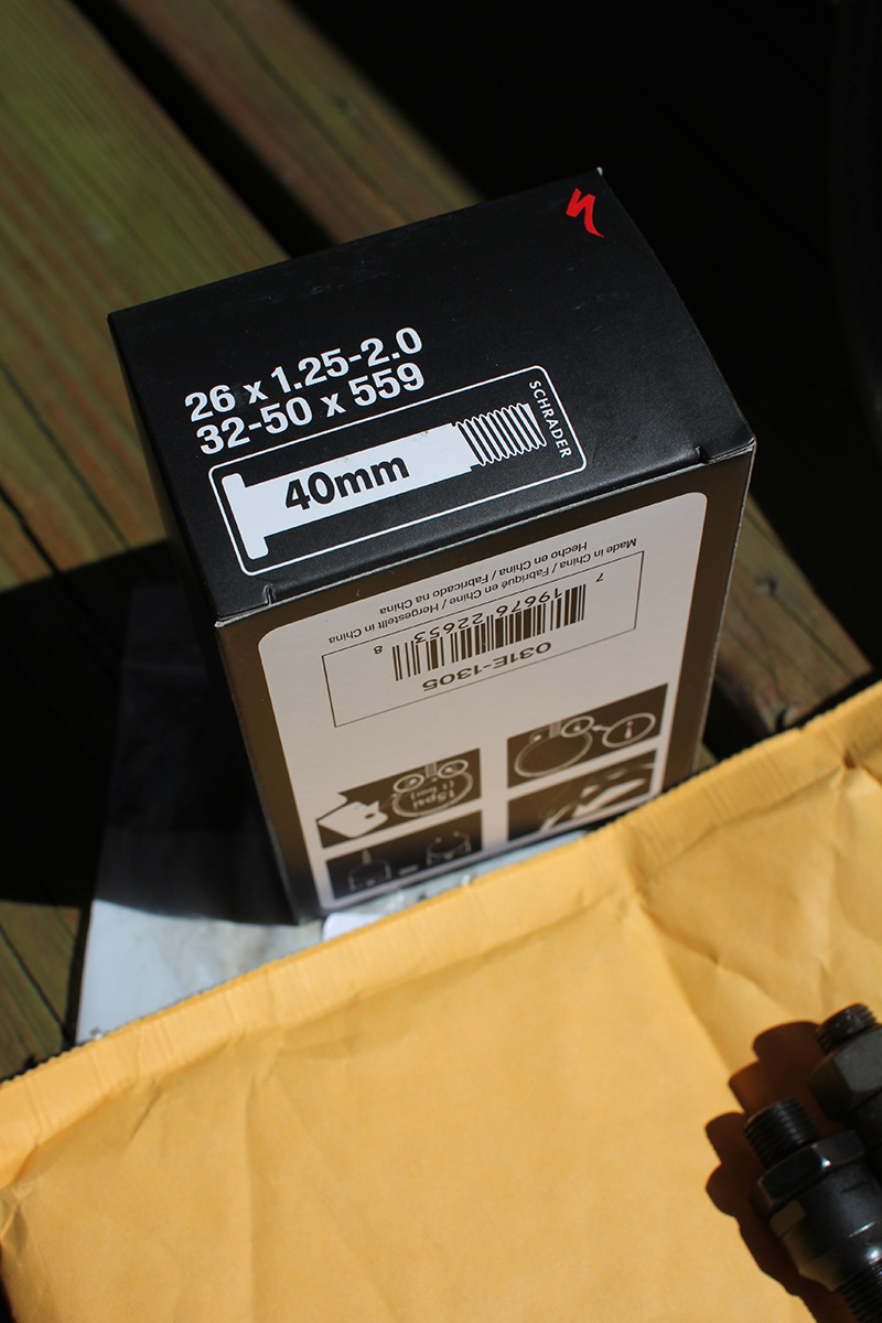 first i put the new kenda road tire on, with the new specialized tube. i used to partially inflate the tube before putting it in the tire, but i realize that's a mistake, as a deflated tube is so much easier to install on the rim. the specialized tube has a pretty long schrader stem (40mm), and even come with a retaining screw so the stem doesn't get pushed back inside the rim, a pretty good feature. the tube and tire went on the wheel effortlessly, i didn't even need any tools. i partially inflated the tube, running my hands around the circumference to make sure nothing was getting caught, before i fully inflated. the wheel was now hard and bouncy.