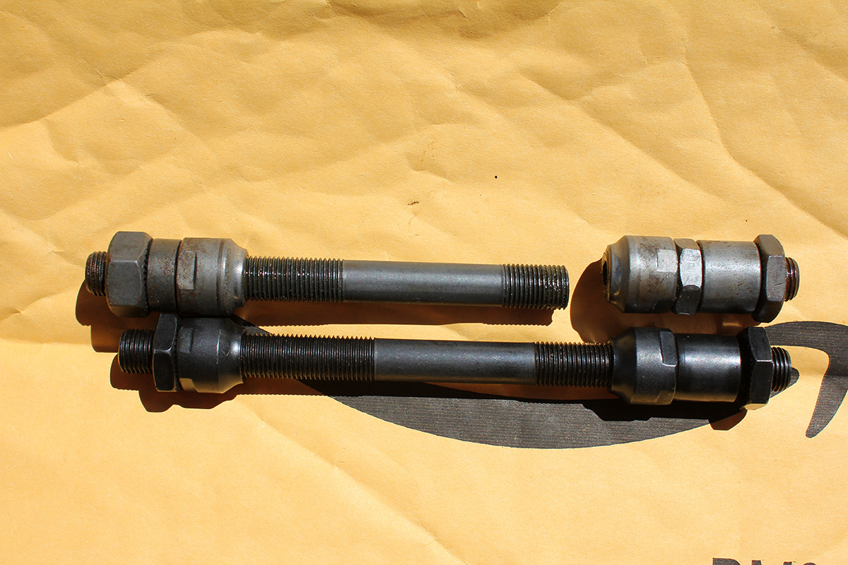 next i prepared the axle, removing all the cones, spacers, and nuts from the old broken axle so i could install them onto the new axle. the new cones are almost the same size as the old ones, but i decided to stick with the previous cones for full compatibility. besides, the old cones still looked like they were in good shape. the new axle also came with its own spacer (just one) and nuts (2); i wonder if those would work with my rear wheel even though they're not the same sizes.
