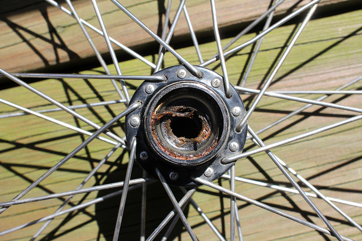 once the axle was prepared, i cleaned out the grease from both sides of the hub shells. i probably never cleaned it before, because the grease wasn't the same color (blue-green) as the grease i use. it also wasn't greasy anymore, more like sticky. i had to use some cotton swabs dipped in alcohol to get the old grease out. on the freewheel side i could remove the rubber dust cap, but on the other side the dust cap didn't seem removable so i just cleaned around it.
