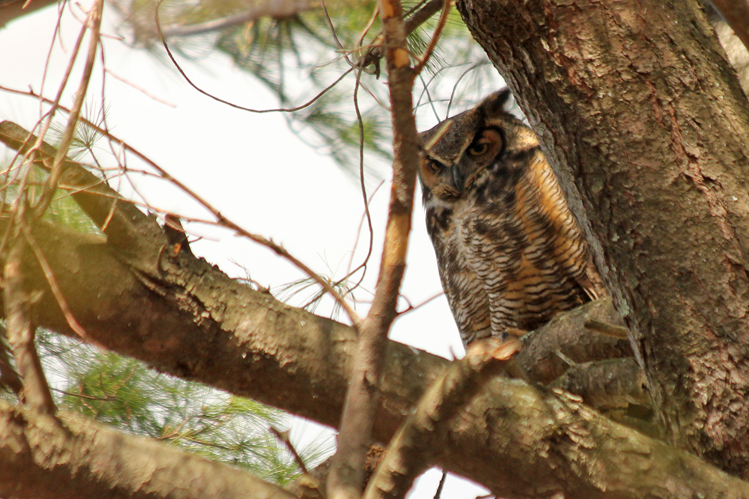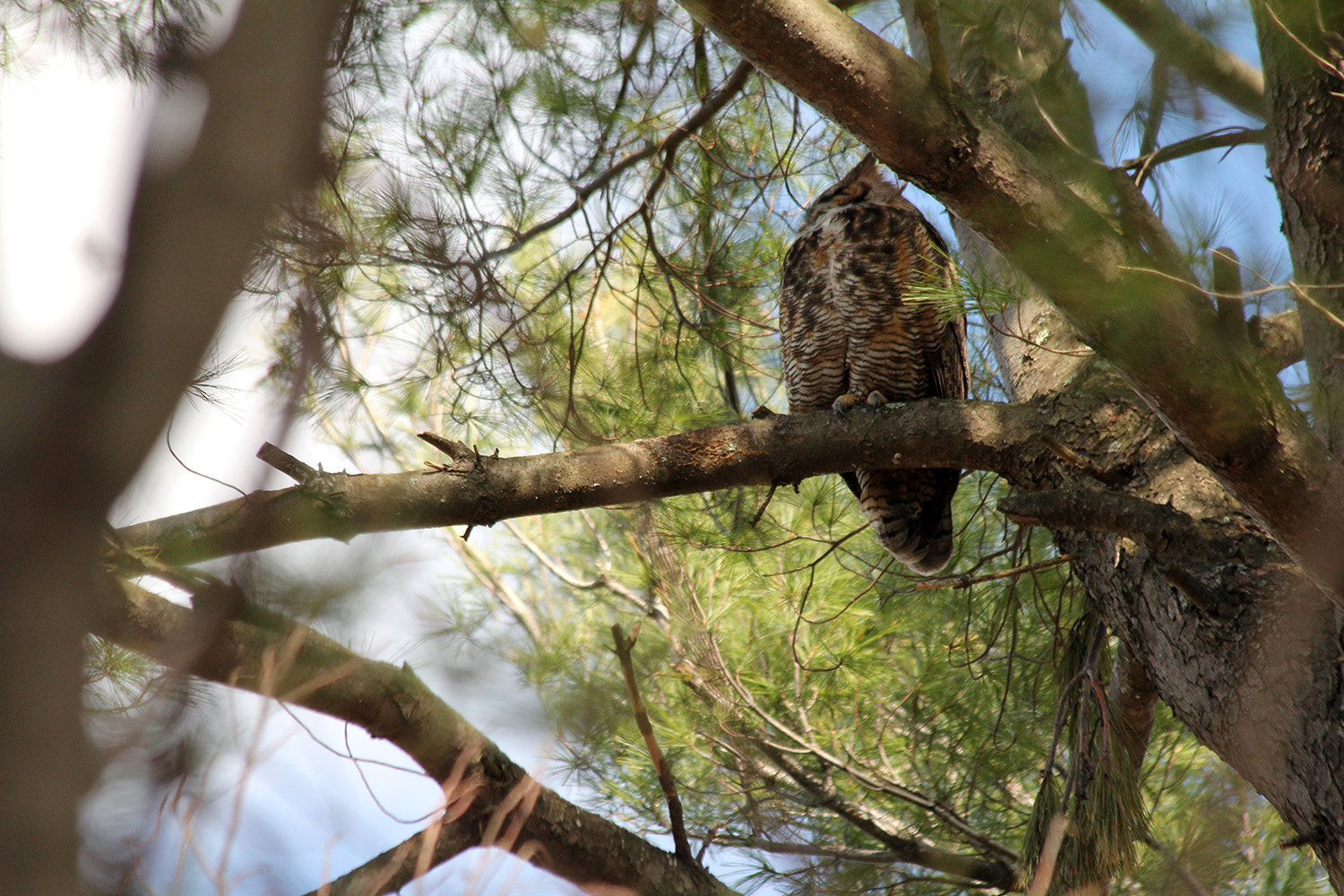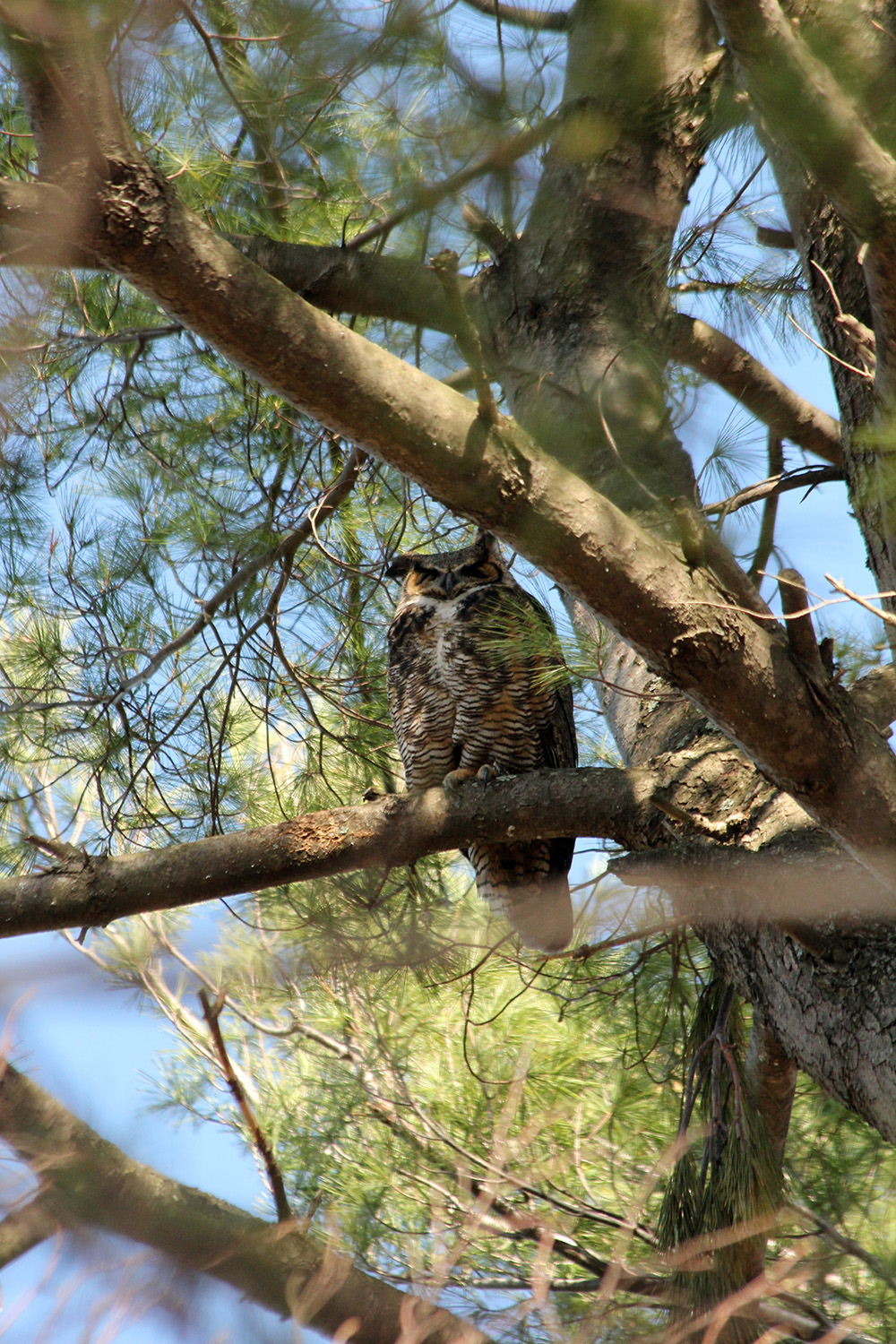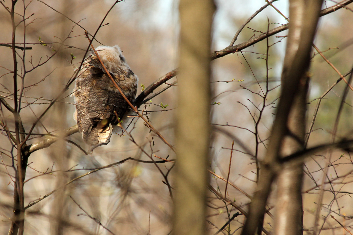 ever since the owlet was spotted weeks ago, people have been crowding around that area of fresh pond. today was no exception, a few folks with binoculars, a few folks with cameras armed with serious lens cannons. i don't think baby owls are particularly photogenic; i was rather hoping to see an adult great horned owl, which i've never seen before in the wild. i followed where everyone was looking and saw the adult right away, sleeping high up in a tree. the baby owl was further down on a different tree. must of its fluff was gone, it was starting to look more like a regular owl, so will probably fledge soon.