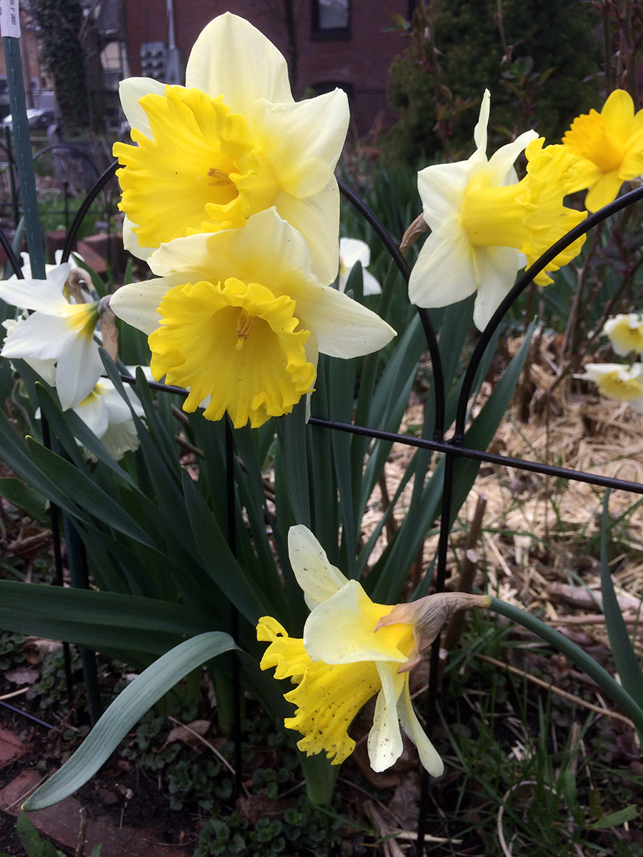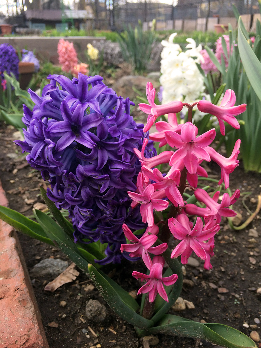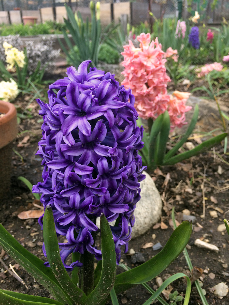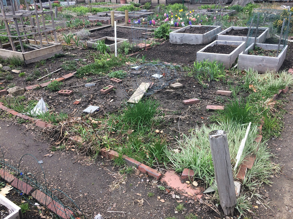 saturday is a mandatory work day at the community garden, so i decided to pay a visit for the first time this year. so early in the season, with the weather just now warming up, the entire community garden was pretty drab, save for some bulbs like daffodils, tulips, and hyacinths. the community garden has also undergone some reconfigurations, with thin plots along the eastern side of the garden along the new fence to the playground (which won't be usable until next year even though it as construction last year).