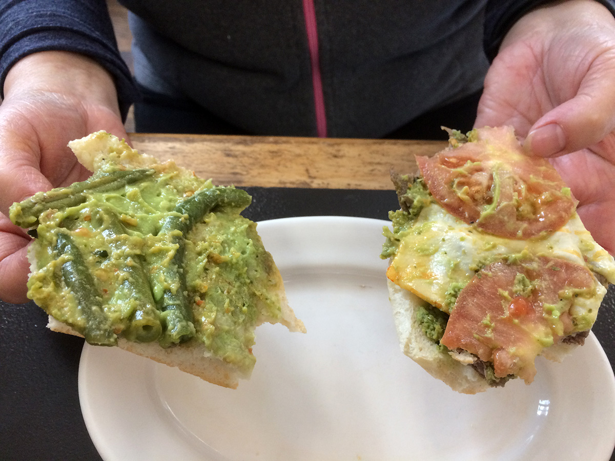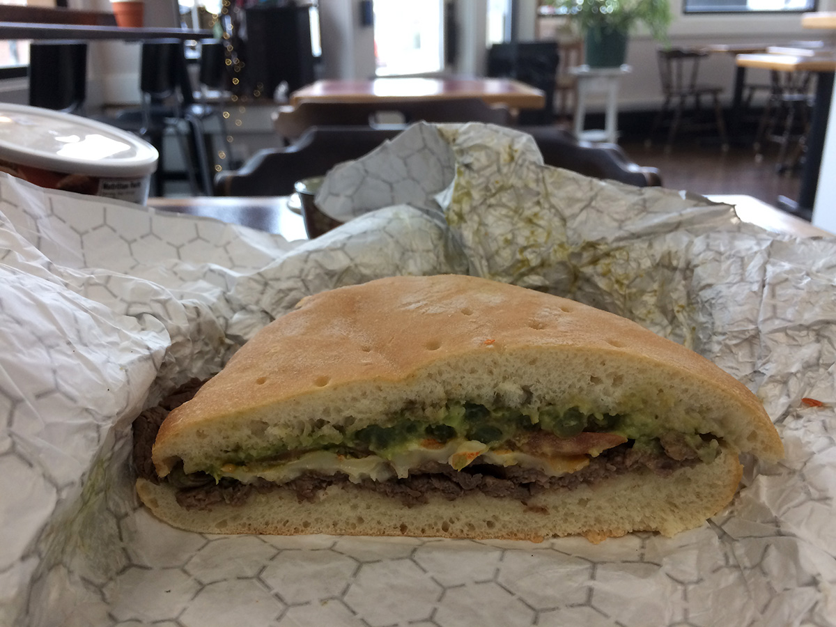 i biked the short distance to chacarero. it was early enough that there were just a few customers, the last time i came the lunch line was out the door. i bought 2 large beef sandwiches at $11 a piece. next time i should try the barbecue beef variety, don't remember ever having that before but it sounds good. when the sandwich maker was assembling my sandwiches, i asked for extra spicy. i brought the insulated tote bag to keep the sandwiches warm.