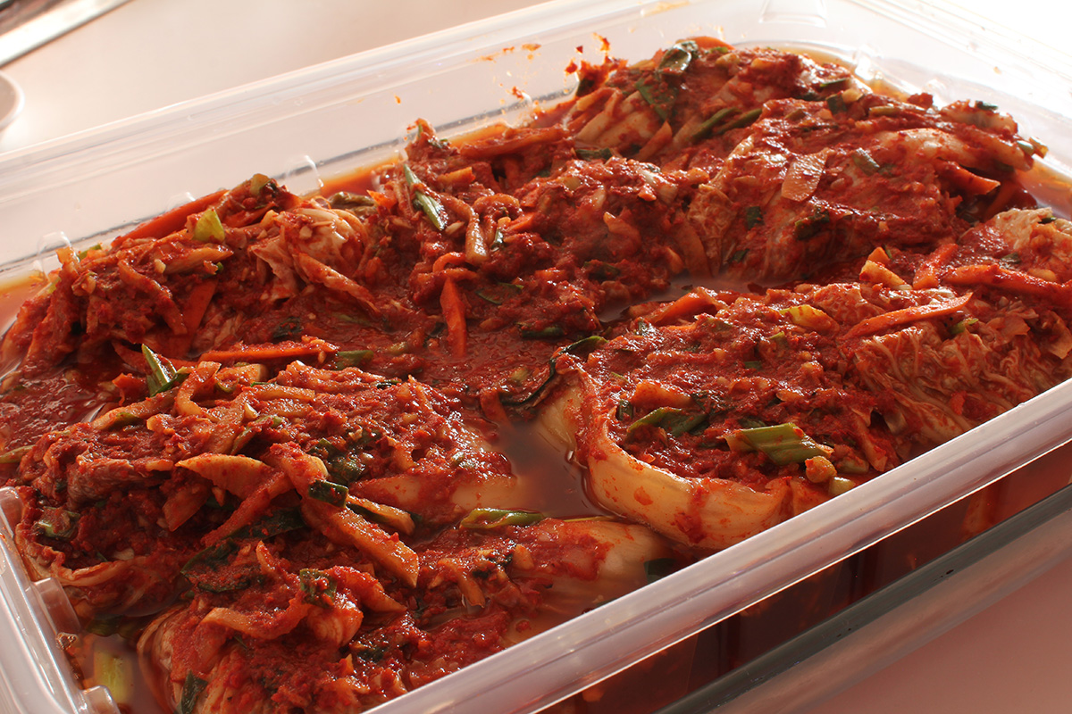 when i got back home i decided to put the kimchi in the refrigerator. my father was worried with the temperature being so high that it might not only make the kimchi ferment faster, but also increase unwanted bacterial growth and potentially spoiling the whole batch. traditional kimchi is fermented in a vessel with a small mouth so the total suface area exposed to area is reduced; i have mine basically sitting in a plastic lasagna container, with a large surface area that could go bad at any point. the container also airtight. if i want to get really fancy, i should look into an airtight container to store my tongbaechu kimchi. i did taste it, cut off a little piece, and it definitely tasted sour. once in the fridge it will continue to ferment, but not as fast as it'd if it sat outside, but also reducing the risk of spoiling.