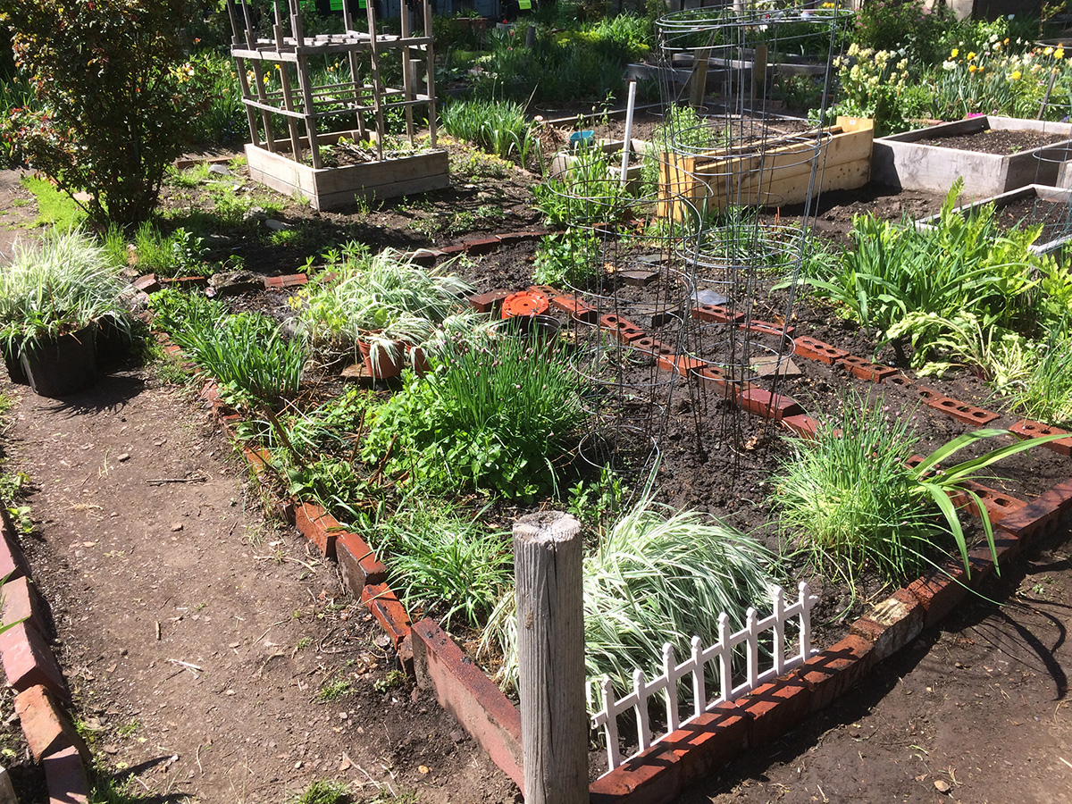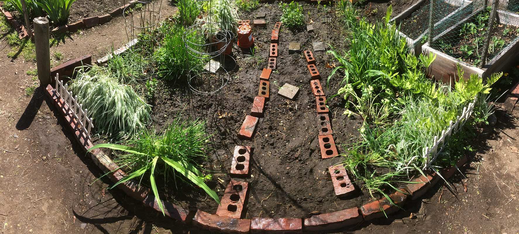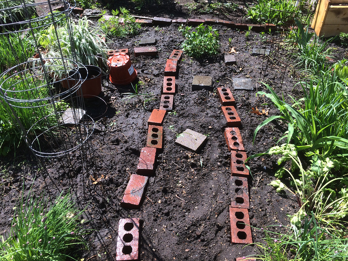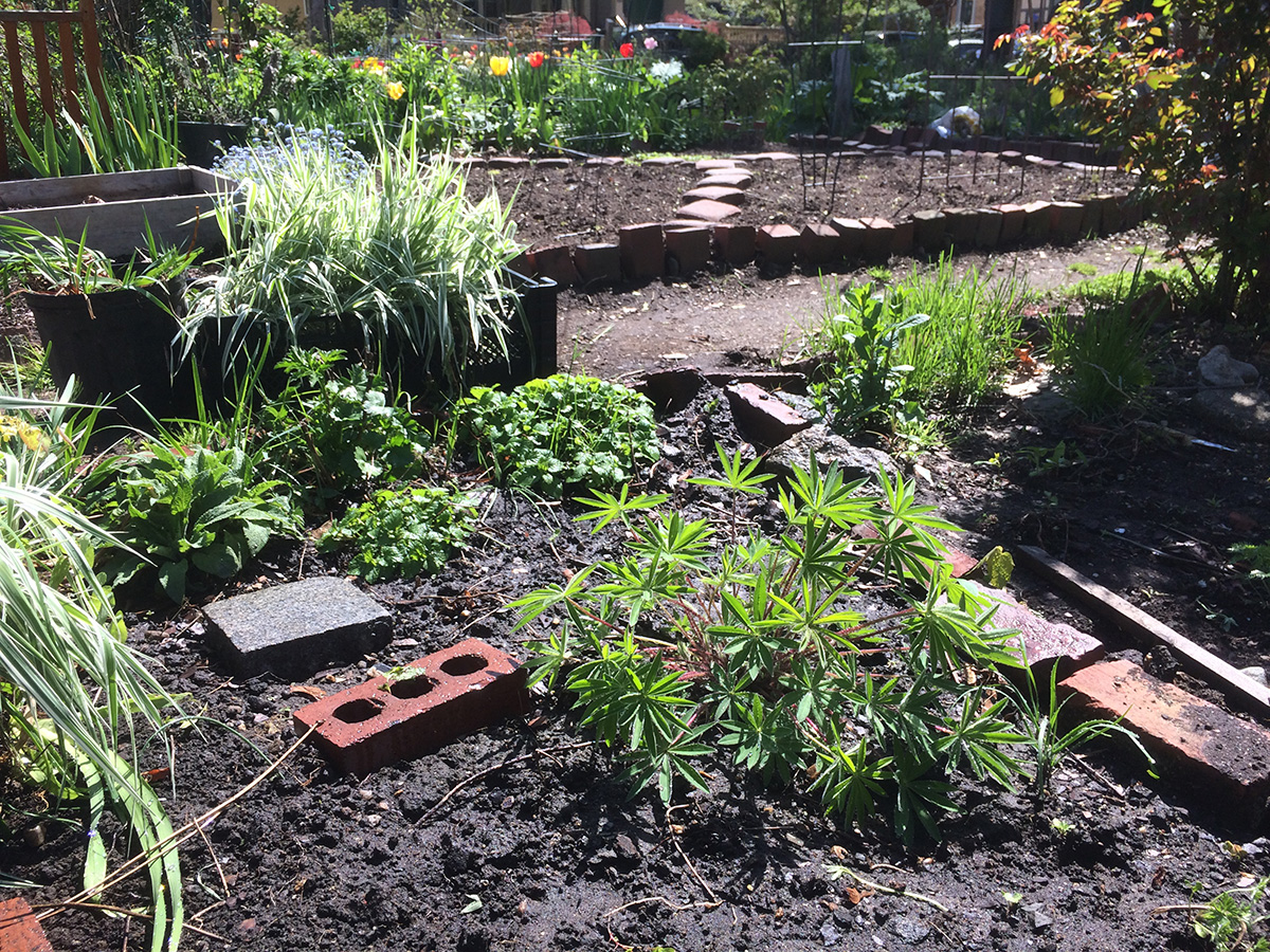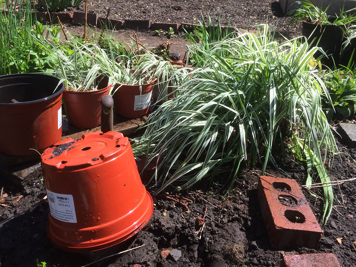 i was planning on taking away all the ornamental grasses, but each patch is so large and heavy, i could only move one patch at a time. i wasn't planning on staying long but i ended up working on my plot for 2 hours. this being my second season in this plot, i knew what plants i wanted and what i wanted to get rid of. ornamental grass was one thing, the other being an invasion of creeping buttercups. the yellow flowers are pretty but they just spread too much. while digging out the buttercups (which were confined to the edges of the plot), i also fixed some of the brick borders, and added more bricks to form a pathway from the pile of unwanted bricks by the garden entrance. i also relocated some plants, moving the lovage so it's not next to the similar looking monkshood, and moving some small delphinium and striped mallow seedlings. i also plugged a few nasturtium seeds around the perimeter.