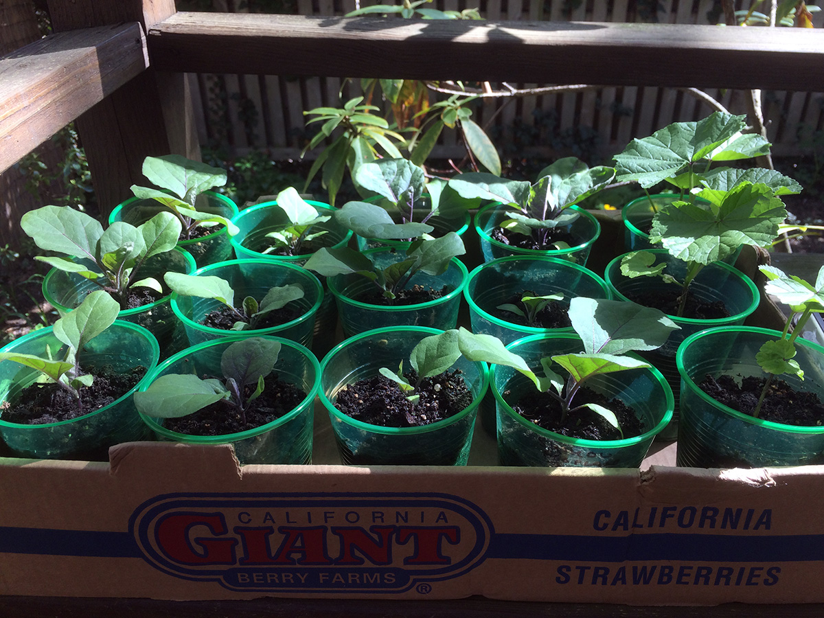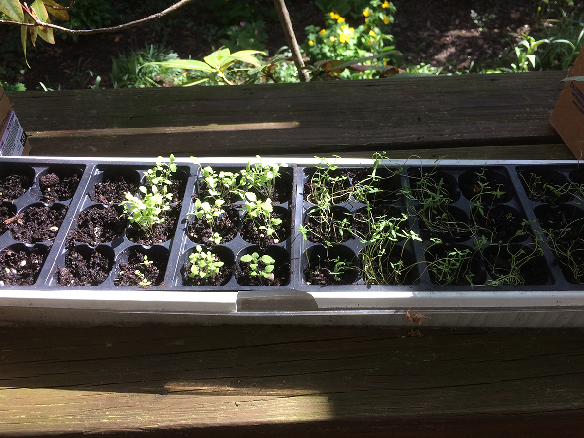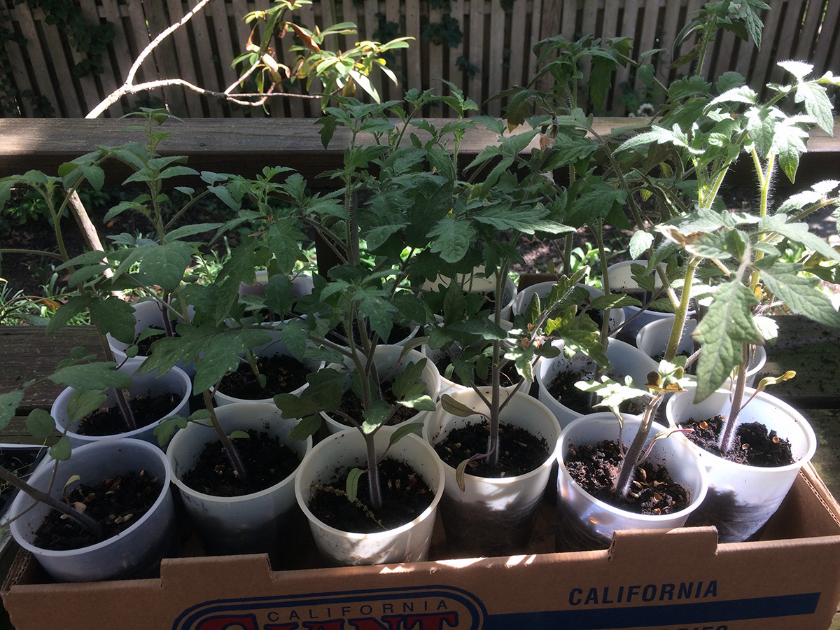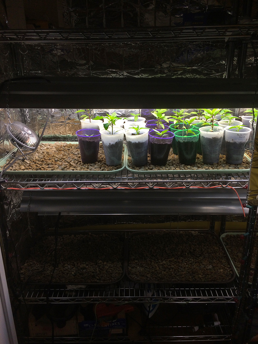 i set out my tomatoes outside these past few days because they were beginning to outgrow the closet. today, i moved out more seedlings. this is to harden them up so they'll be ready for transplanting, but it's really more because it's just much warmer and sunnier outside. later in the evening, when the temperature dipped below 60°F, i moved all the plants back inside. i moved enough plants that i was able to turn off the fluorescent lights on one of the grow house shelves. the only plants still in the closet are numerous thai basils and 2 variety of hot peppers.
