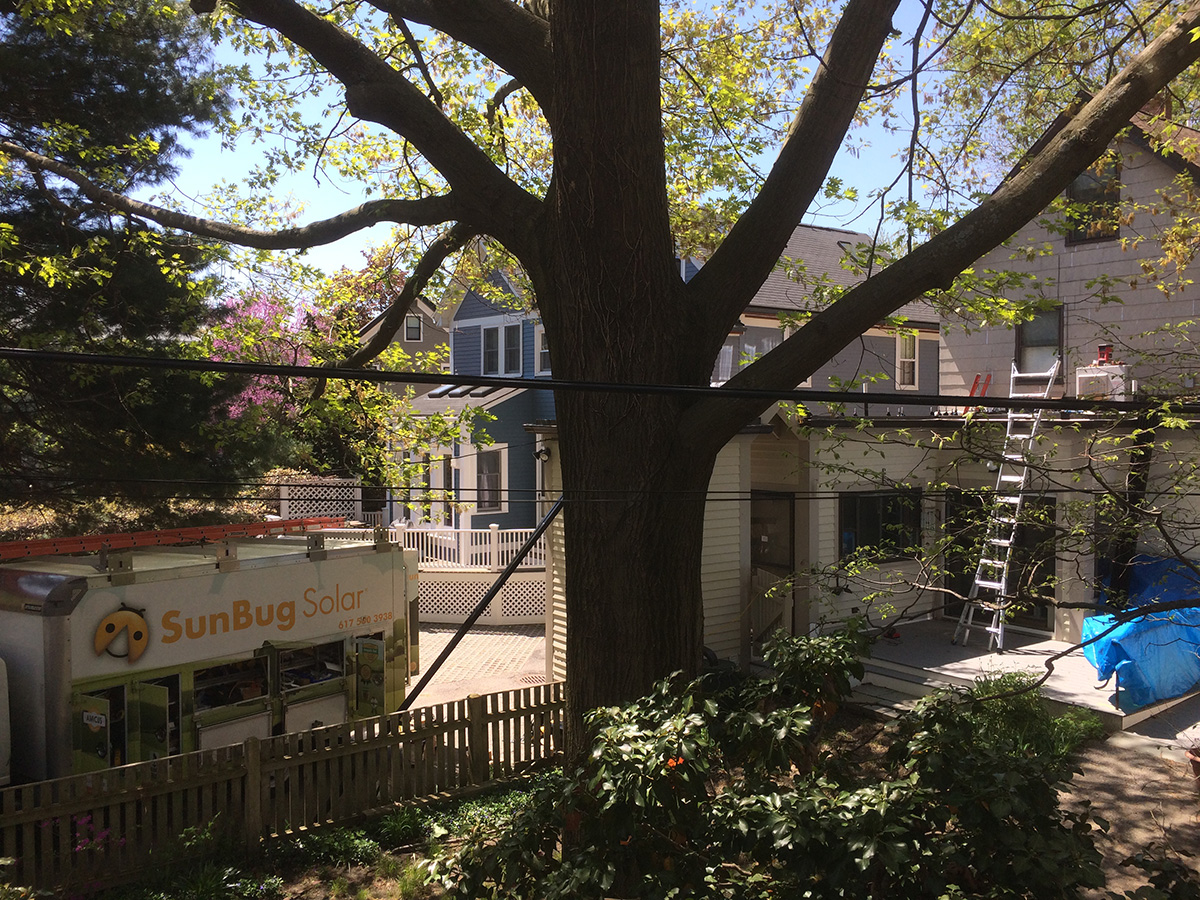 i returned home by around 11:20am. once again there was construction at the end of my street and the road crew had set up a detour sign. i decided to move the rest of my grow closet seedlings, the thai basils and the hot peppers. while in the backyard, i noticed some construction activity at my backyard neighbor's house. having seen enough of it, i learned to recognize solar panel struts. i climbed to the 2nd landing and saw the sunbug solar van. they didn't install the panels yet, but i was surprised they put rails on the flat roof of the house extension. i wonder if that little old lady kate still lives there? doesn't seem like the kind of project a widow living off of her retirement savings would engage in.