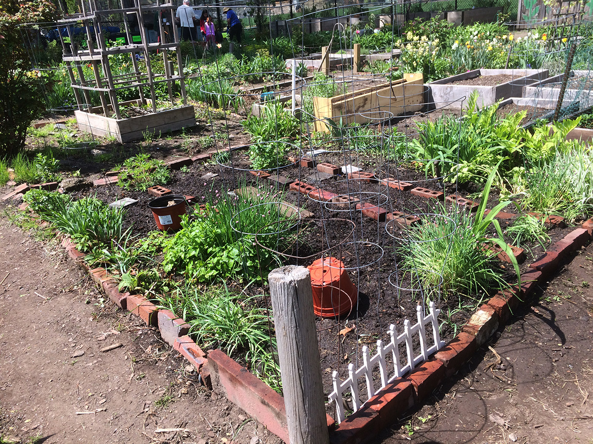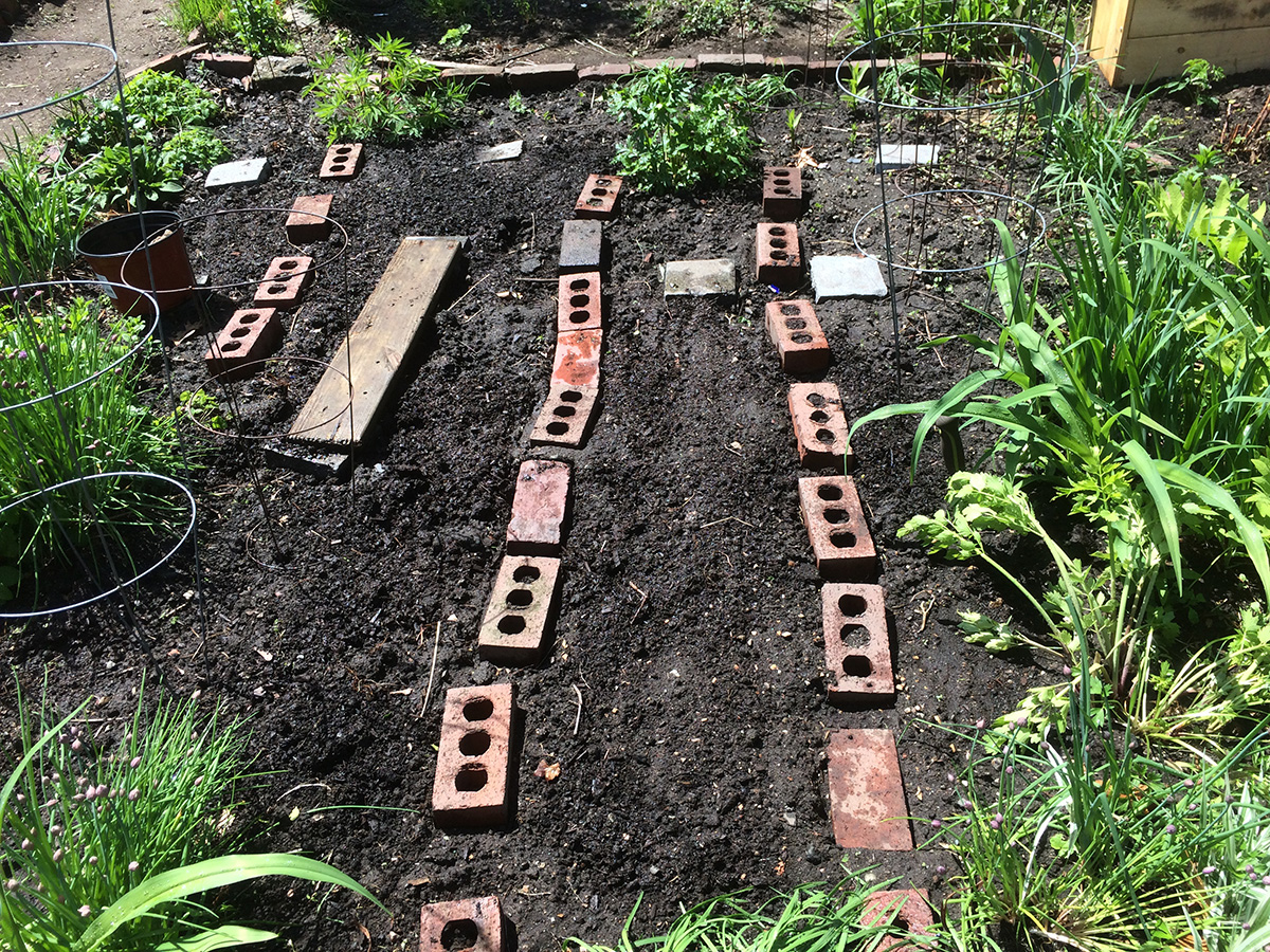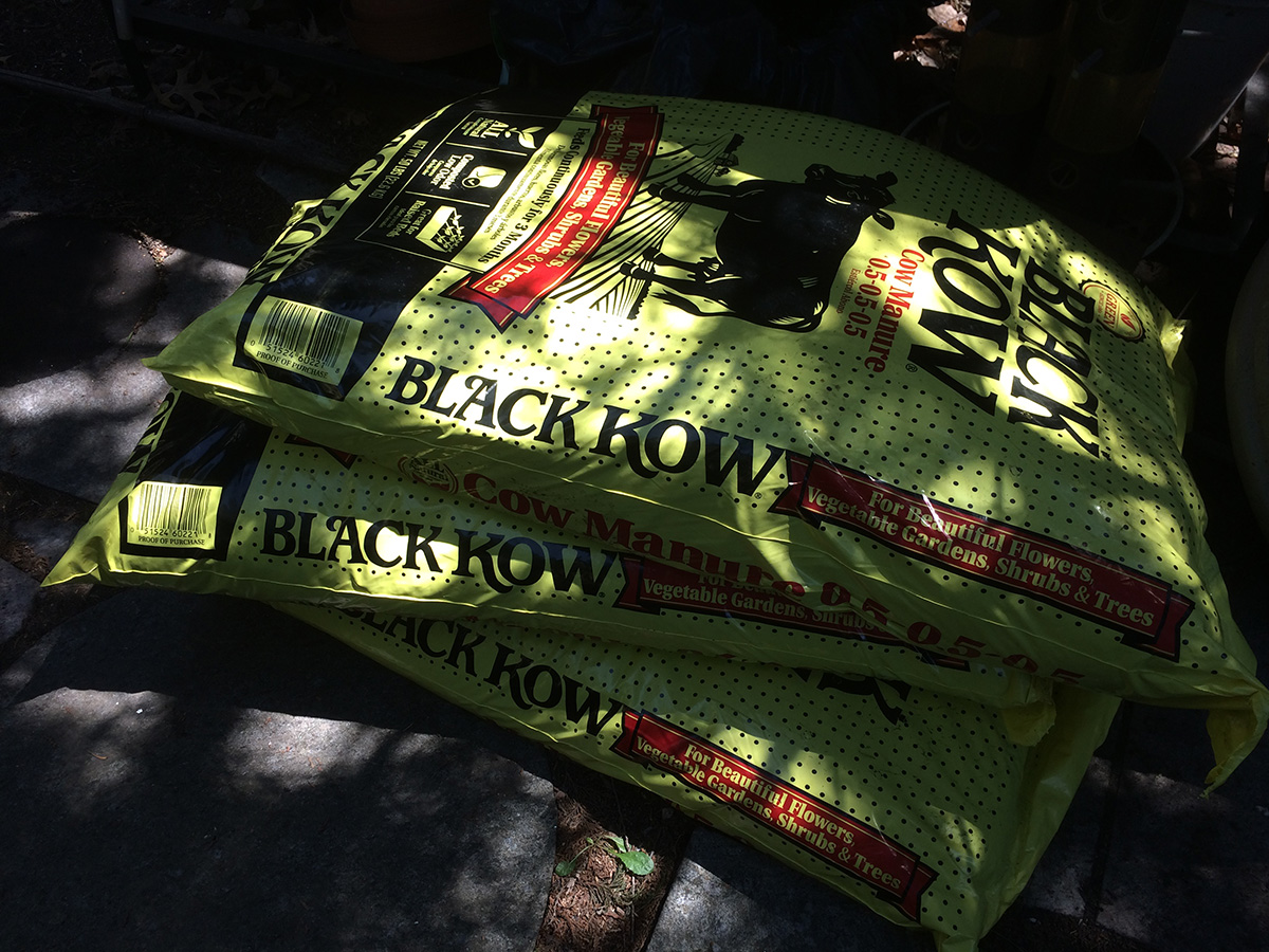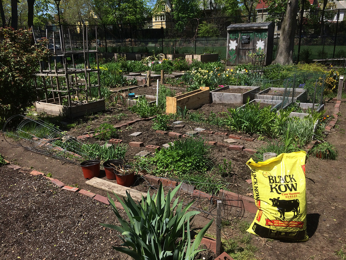 after a salmon bagel sandwich for lunch, i went to the community garden after 1pm with the bag of manure draped on the back of my cargo bike to do some more work in my plot. i planted the garlic chives around the garden perimeter then spread the crumbled manure all over my plot. the manure doesn't really do too much, it has a very small amount of fertilizing effect, it's mostly just dirt. to feed my plants i use plant-tone granules. before i left, a big noisy family of children, parents, and grand parents descended on one of the shady northwestern plots. after watering my plants i quickly left.