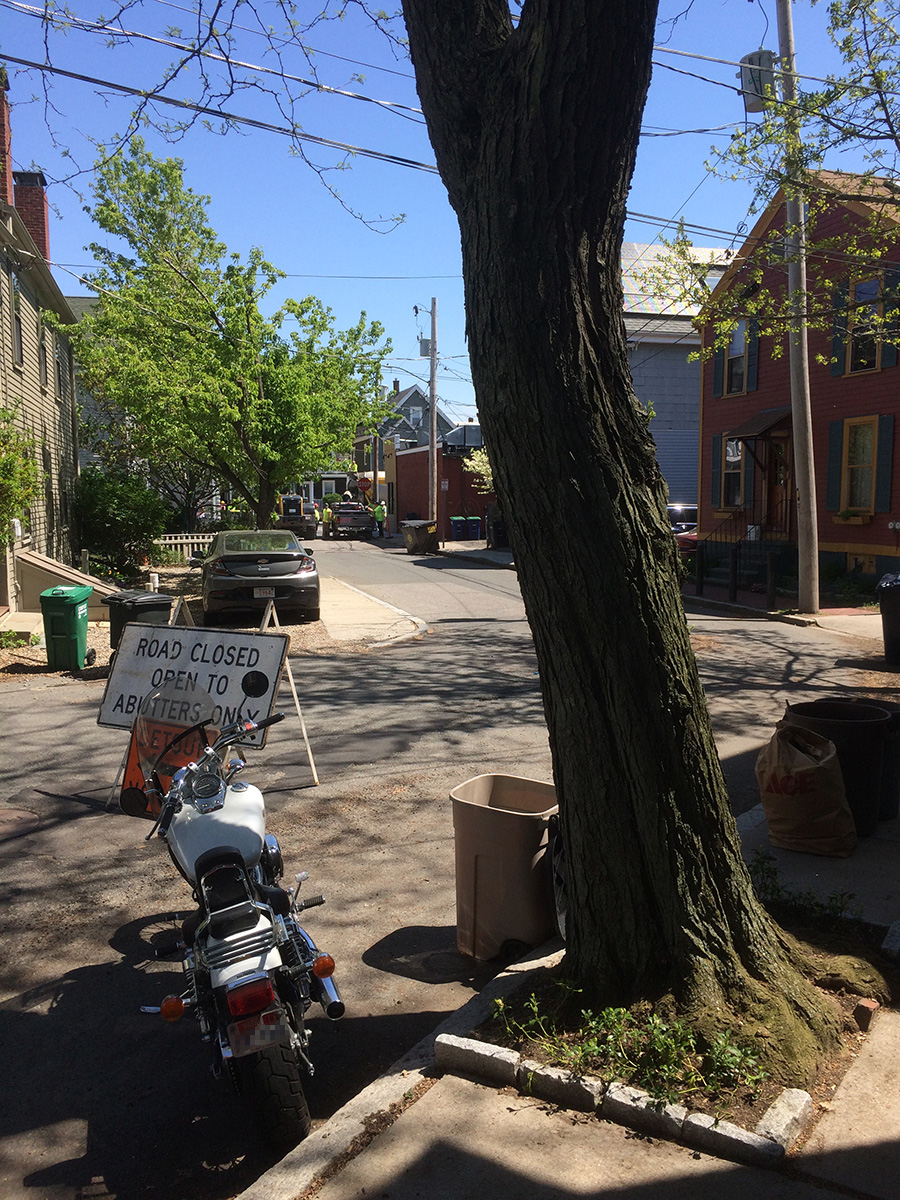 i e-mailed somerville construction to let them know that the road crew had once again forgot to take down the detour sign after they finished working. the deputy director of communications replied back to me, said she'd informed the construction supervisor. when i came back from my grocery trip i saw the signed had been moved. i sent the deputy a thank you note. but turns out it was probably just an equally disgruntled neighbor that moved the sign, because the construction work wasn't actually finished yet, as the construction came back around 6pm, doing some more work on the road.