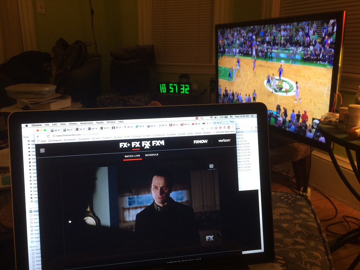 between 9-11pm was the most intense hours i've had all week. while i was watching game 5 of the playoffs between the sixers and celtics (boston up 3-1, a victory would put them into the eastern conference final against lebron james and the cavaliers, a repeat of last year), i was also watching the latest episode of the expanse beginning at 9pm. syfy's website has the option to livestream the broadcast, but it's never worked for me. instead, i discovered the mobdro app for android, which livestreams various cable channels, one of which was the syfy network. it's probably illegal, and you have to side-load the app as it doesn't appear in the google play store, but if it meant i didn't have to wait hours later to download the episode in order to watch it, then i was doing it. at 10pm i began watching the americans on FX through mobdro. everything was going great until around the half-hour mark the app told me the stream was no longer available. fortunately FX's website does have livestreams, so after inputting the necessary authentication info, i was back in business. approaching 11pm, i was equally riveted by the final minutes of a pivotal episode as well as watching the final minutes of a close game that ended with a celtics victory.