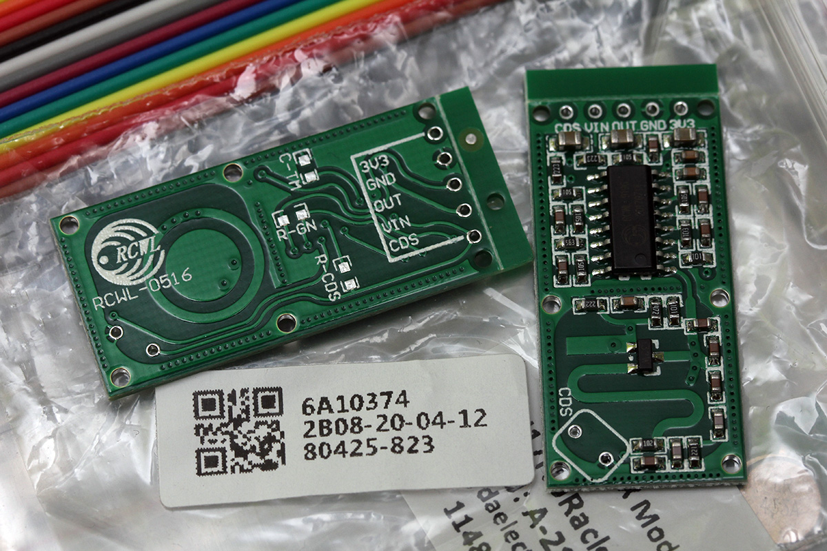 my RCWL-0516 microwave radar sensors arrived in the mail today. i can't use them right away as they still require pins to be soldered onto the board.