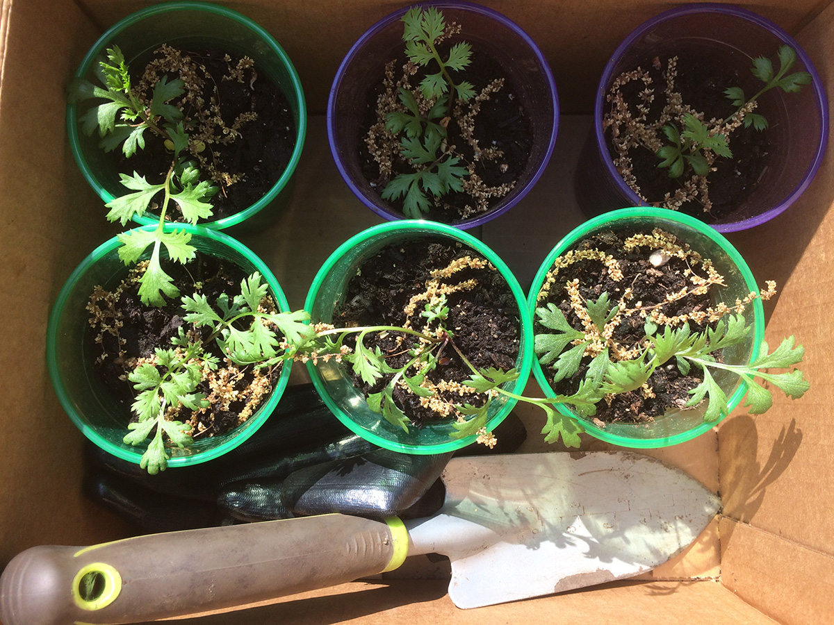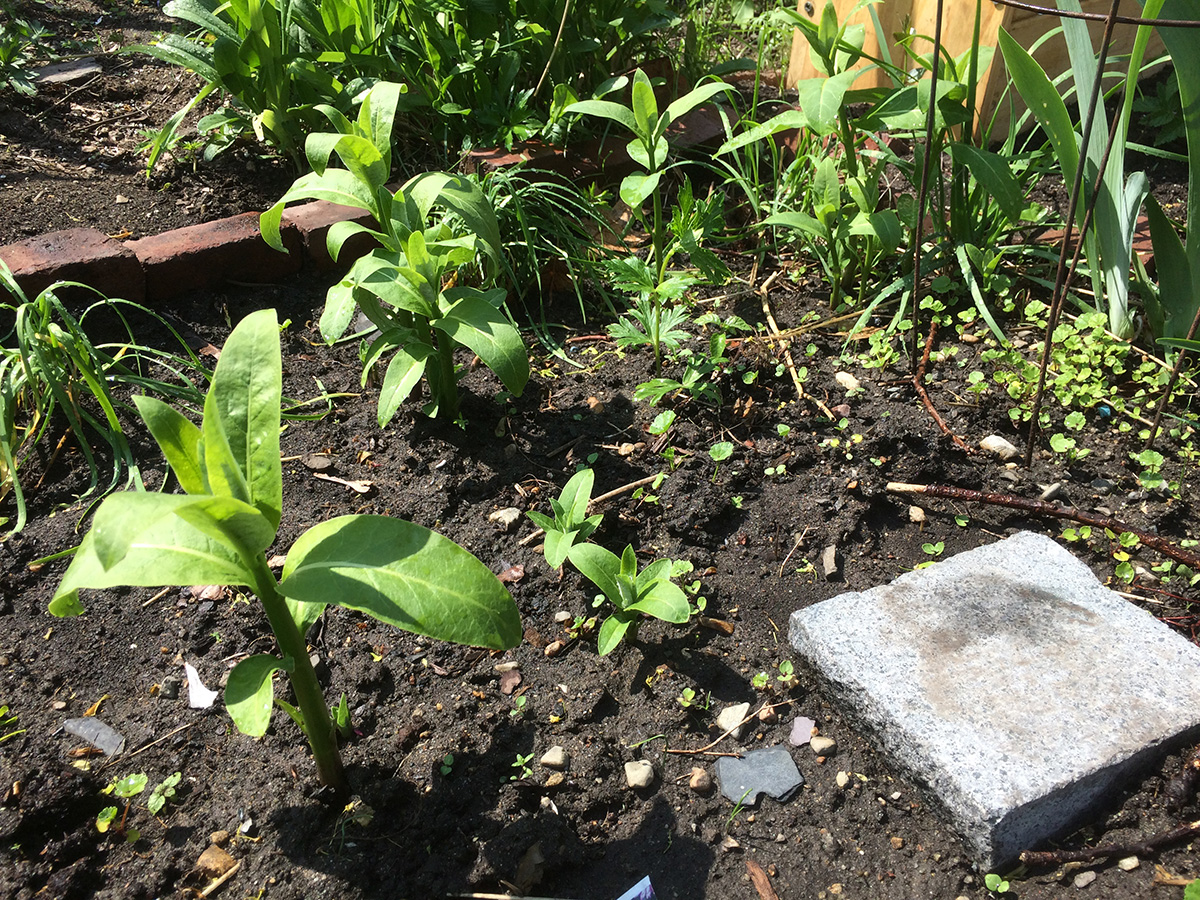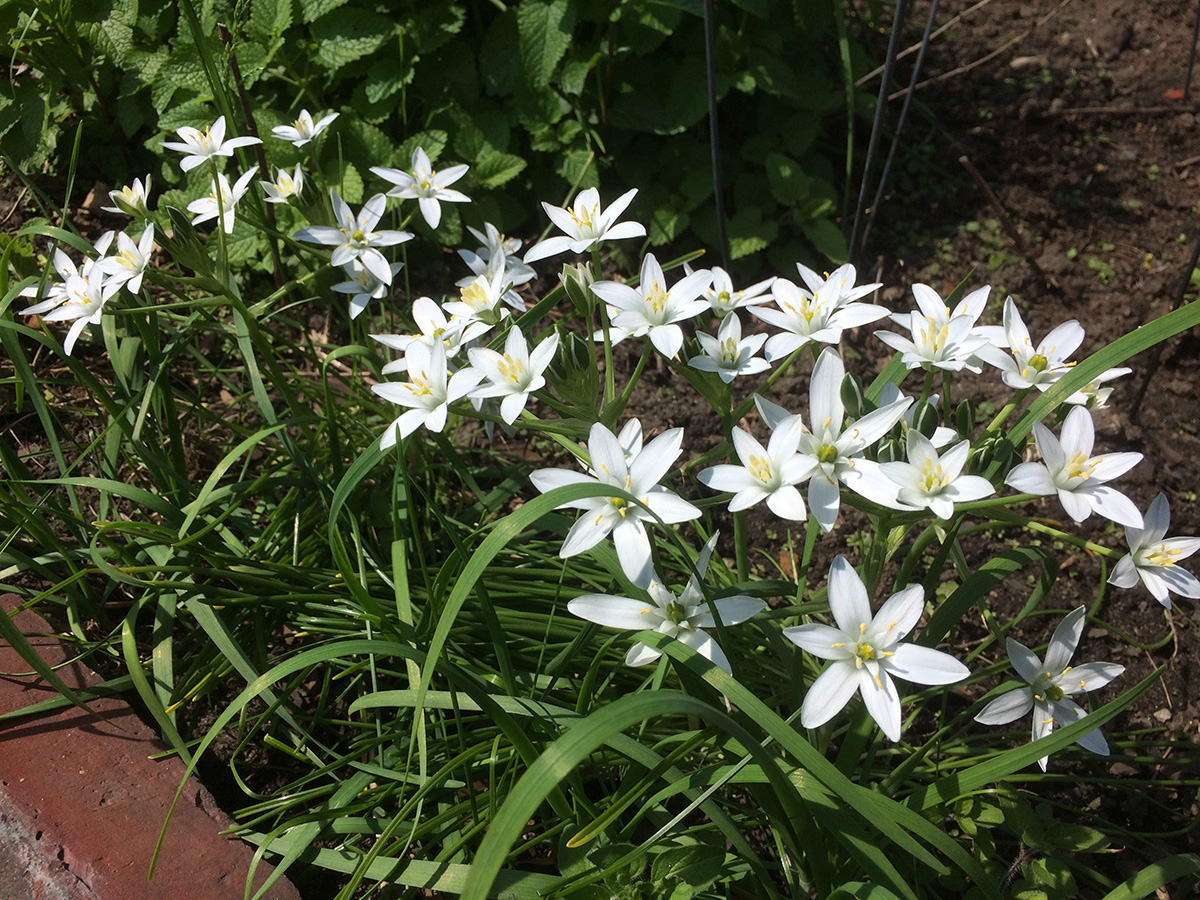 in the afternoon i walked down to the community garden with half a dozen red chrysanthemums (Chrysanthemum coccineum 'robinson red') to transplant. it was humid and hot, with a forecast of torrential downpours and thunderstorms by late afternoon. i haven't been to the garden since friday. not much have changed, except more star-of-bethlehem flowers have blossomed. the milkweeds are also a bit taller than last time. i have a lot of striped mallow seedlings but i'm worried they might get eaten by slugs, though i haven't seen any evidence of that. i planted the red chrysanthemums along the southeastern corner and eastern edge of my garden plot. they're perennials and if they grow well, the red flowers will nicely compliment the white garlic chive flowers.