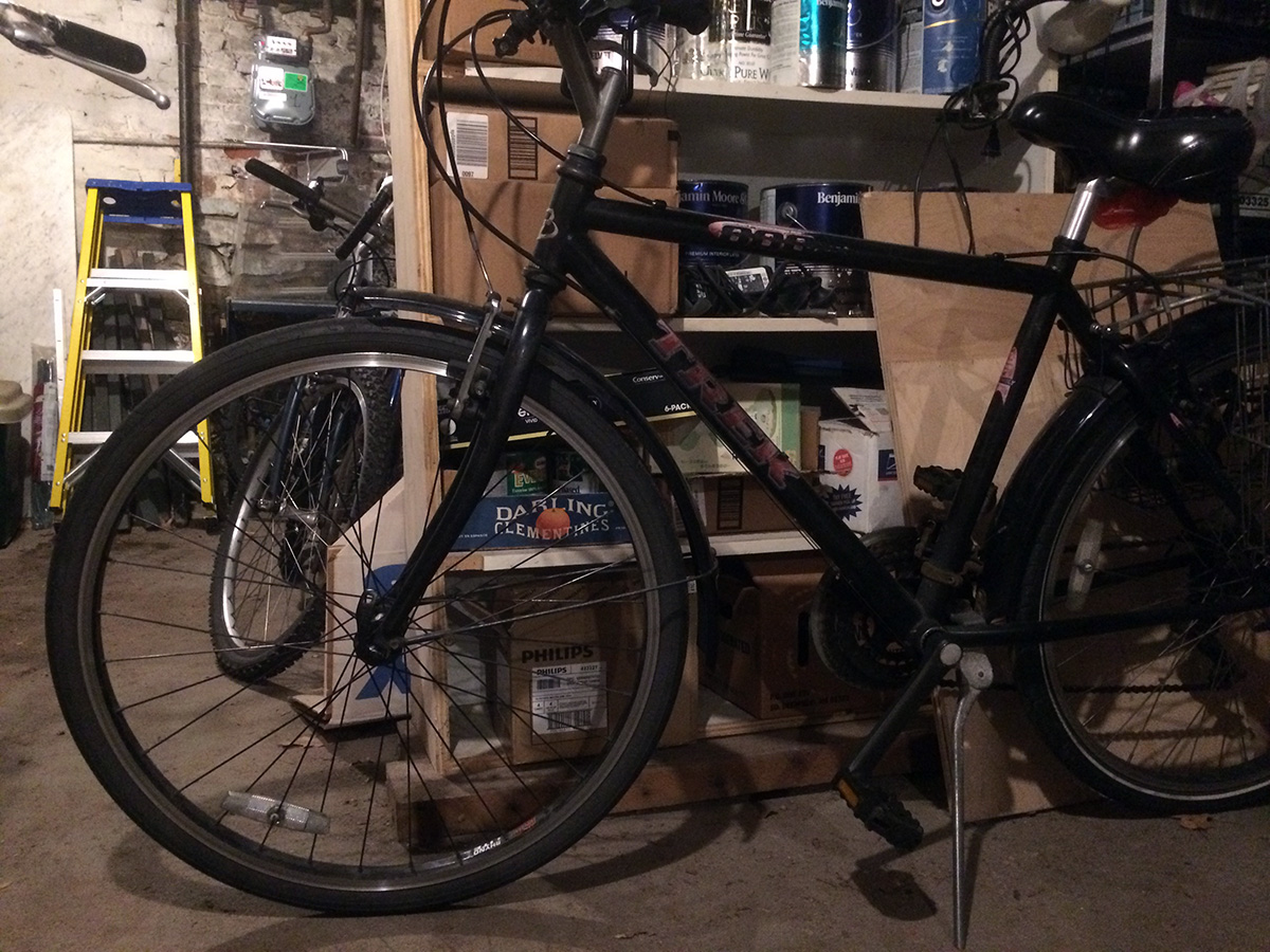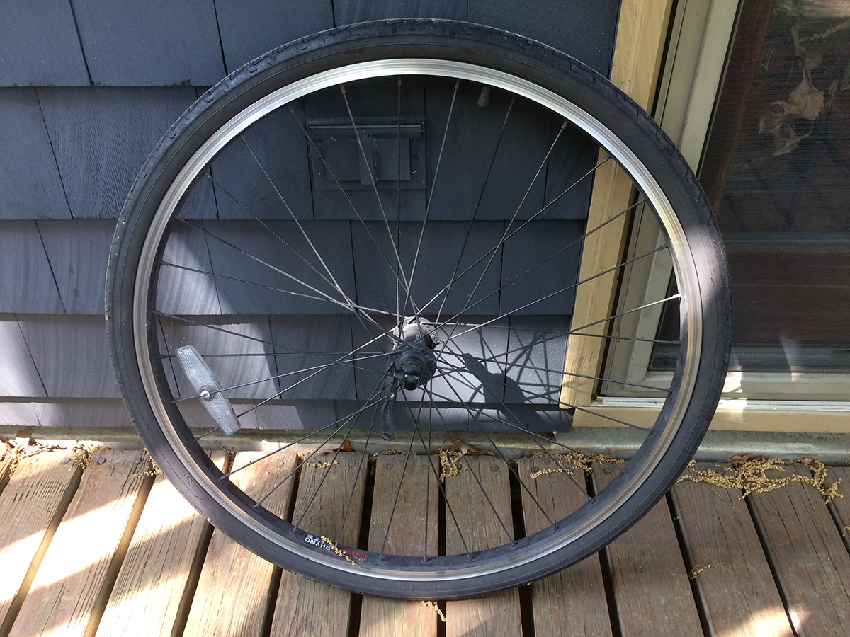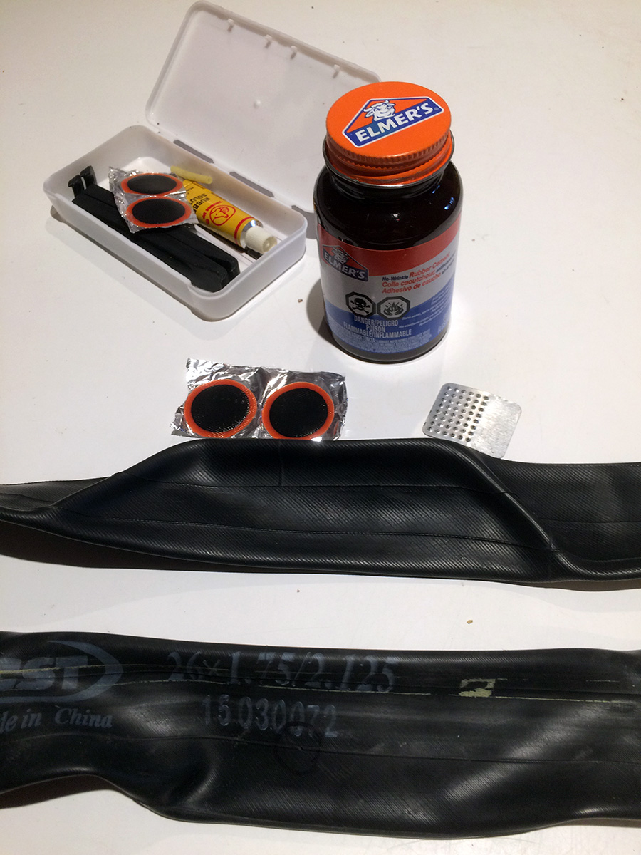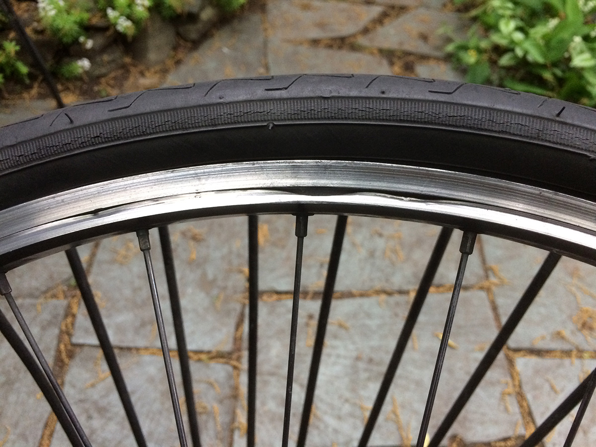 patching was easy, and once i applied the patch, i took the tube outside to put it back into the wheel. it was 4:15pm, by then the outside air was warm and humid, and the sky quickly darkening, like it might rain at any moment. the tire took some effort to remove from the rim, and took an equally difficult time to put back onto the rim. i ended up using a metal tire lever to push the tire in place. after pumping up the tire, i installed it back onto the bike, everything looks good. however, i did notice that the brake surface of the rim is heavily scratched up to the point where the rim itself might lose structural integrity. i may need to buy a new front wheel at some point (the rear wheel was replaced back in july 2012).