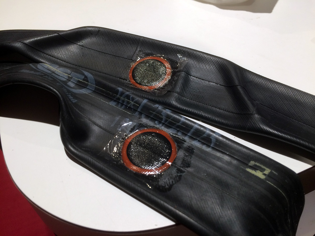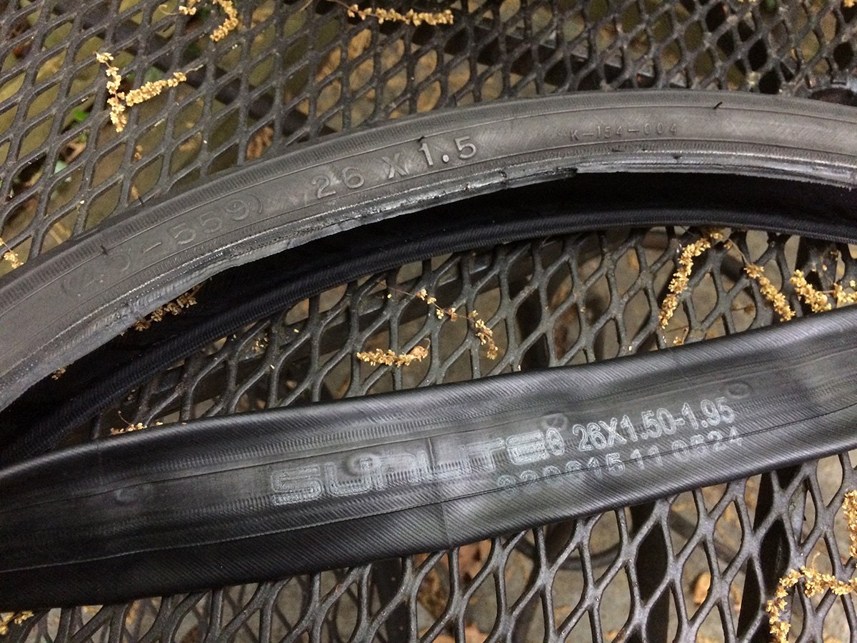 when i went to the basement to check on the status of my bike tire, i was dismayed to see it's gone flat since i pumped it up on sunday night. i removed the front wheel from the frame and went about removing the tube from the tire. i used tape to mark my position, so i could put everything back in the same direction but also be able to check the inside of the tire for embedded puncture objects once i located the leak on the tube. i couldn't find the leak when i dunked the tube in the bathtub. but after i inflated the tube, the leak was pretty obvious, a steady stream of bubbles. i was also happy to see that the hole was facing outwards (to the road surface), meaning it was a simple puncture, and not something wrong with the wheel itself. i did the same trick with another old tube, found the leak easily. this tube however had the leak facing inwards, meaning maybe the puncture was caused by a loose spoke or something else.