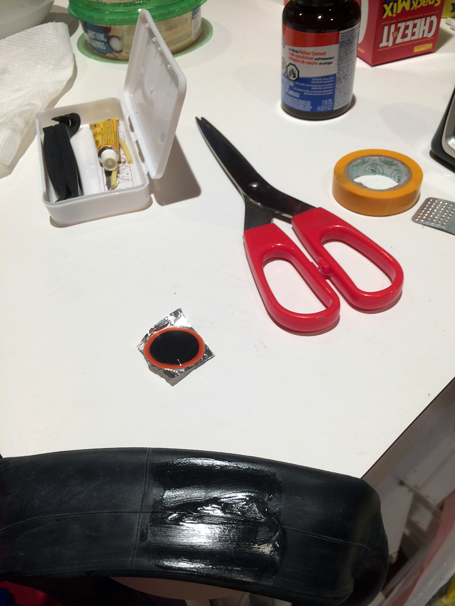 this tube had never been patched before, so was worth saving if i could just find the puncture. it took a while because the gash was so great the tube wouldn't even inflate enough to test. i finally found the damage, a 1/2cm tear, which i circled with a sharpie. i dried the tube, abraded the area around the puncture, smeared some rubber cement, waited for it to dry, then finally applied the rubber patch. before reassembling the wheel, i looked inside the tire to see where the puncture was and to make sure the sharp object wasn't still there. i found the matching gash in the tire but the sharp object was long gone. i finally reassembled the wheel with the fixed tube and waited to see what would happen. in the meantime, i retested that thrice patched tube hanging from a chair in my kitchen, this time properly inflated to make any leaks more noticeable. strangely, there were no leaks, so i decided to put it back into the spare rear tire again. everything looked good, but soon both tires went flat, including the patch i did previously.