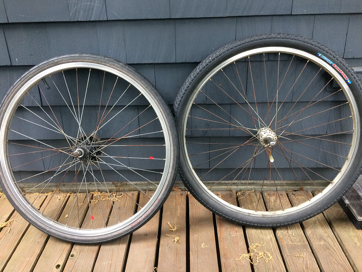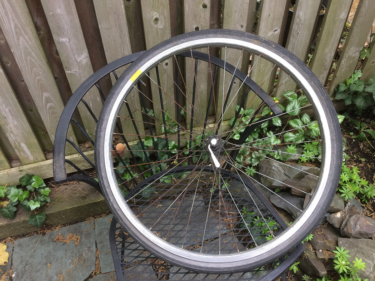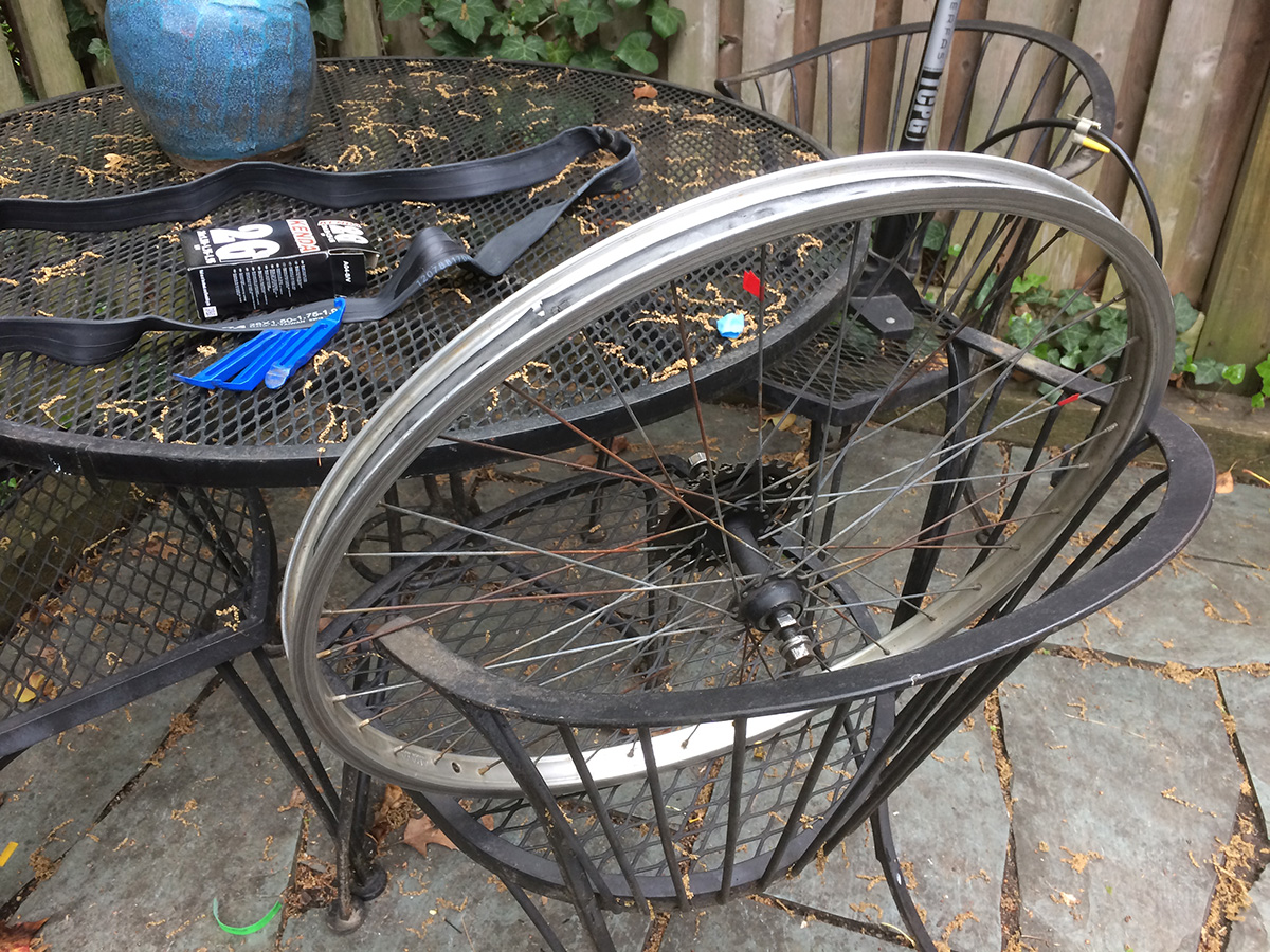 but that wasn't the end of my bicycle tire repair fun! i had a 26x1.75/2.125" patched tube from yesterday i wanted to install. i thought about that rear wheel, but the tire takes 26x1.5" and this tube wouldn't be a good fit. fortunately i have yet another wheel in the basement, this one with a brand new fat kenda komfort 26x1.95" tire. so i installed that tube into that wheel. as for the rear tire, i decided to install a brand new kenda tube. i almost didn't want to, a new tube was too good for that junky spare trek. but this would let me know right away if all the problems i've been having with the wheel is because there's something wrong with the wheel itself (like puncturing spokes) or simply bad tubes. after inflating both wheels i set them outside to see if they'll deflate. i checked later in the evening, they were both still inflated.