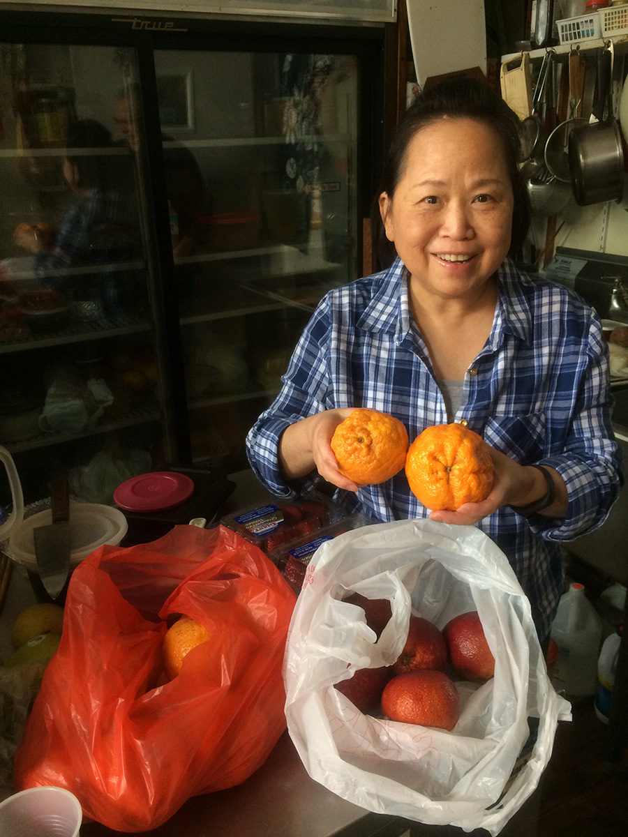 i went directly to the cafe to drop off the latest market basket haul. we tried one of the golden nugget oranges. though much bigger than last time, i didn't think they were as sweet, just so-so.