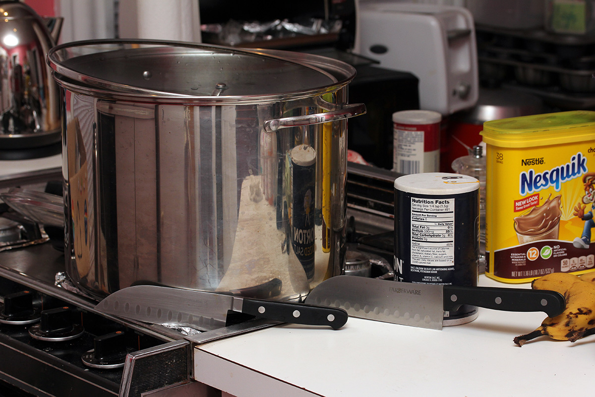 back at home, i cleaned out the stockpot with a brillo pad. it's stainless steel (i tested it with a magnet) and is in pretty good condition with the exception of a dent at the bottom from where the previously owner probably dropped it at some point. not sure what i'll do with it since i already have a 16 qt. stock pot, maybe give it to my sister if she wants it. as for the knives, one is a stamped faberware, the other a forged calphalon. but of them need sharpening.