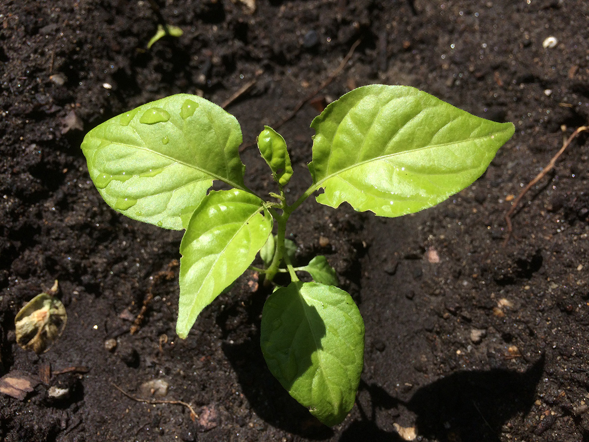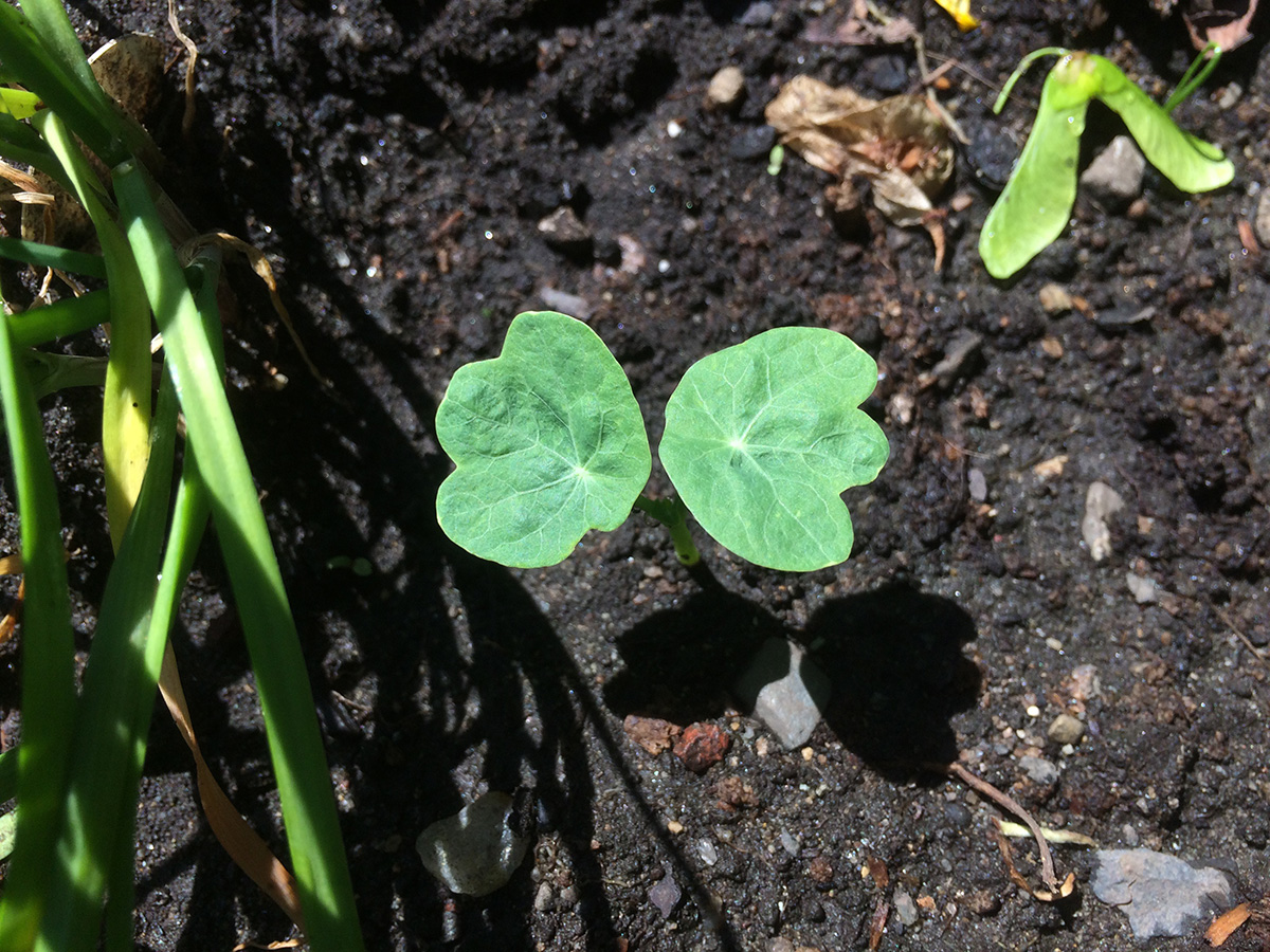 i went to the garden to water my plants. i planted the rosemary on the southwestern corner; it might not get maximum sun, but it'll have plenty of room to grow. i was happy to see that one of my nasturtium seedlings have sprouted. i was not happy to see that one of the hot peppers has some insect/slug damage. it makes me worried that i should be protecting all my tender seedlings but i'm going to wait until there's more damage more i do that; maybe it's just a fluke (but in my experience, it's never a single time thing). i also planted some summer squash (zucchini) and several mounds of cucumbers interspersed through my tomatoes. i planted some nasturtium seedlings as well (red variety) and some sunflowers.
