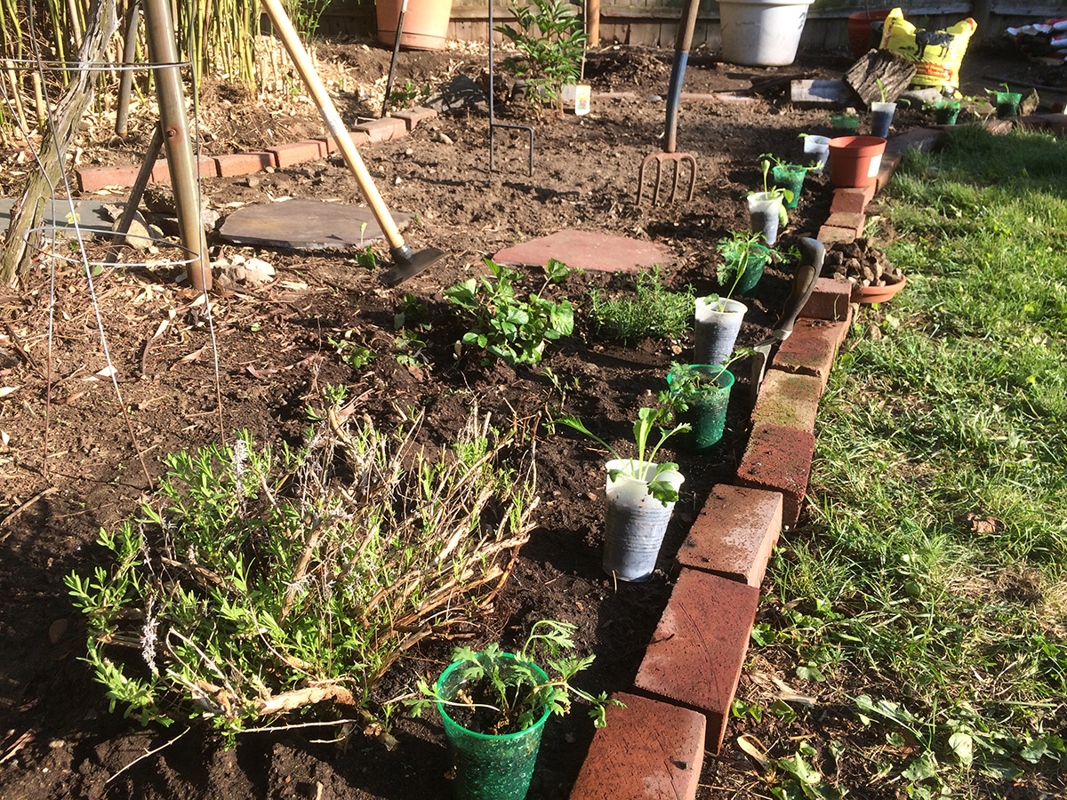 i relocated the lavender plants after first tilling the soil of their new location. there was one main plant and several smaller plants, which i strung out in a row. not sure how well they do, but the neighboring sages have done very well since we moved them so hopefully the lavenders will do the same. next to the lavender i planted the rosemary we bought from home depot on saturday. i still didn't get around to planting my vegetable seedlings yet, but i did lay them out in place. as for the perennial flower seedlings, i put them out in a row along our new perennial garden bed, alternating between red chrysanthemums and white daisies. saturday will be the big planting day.