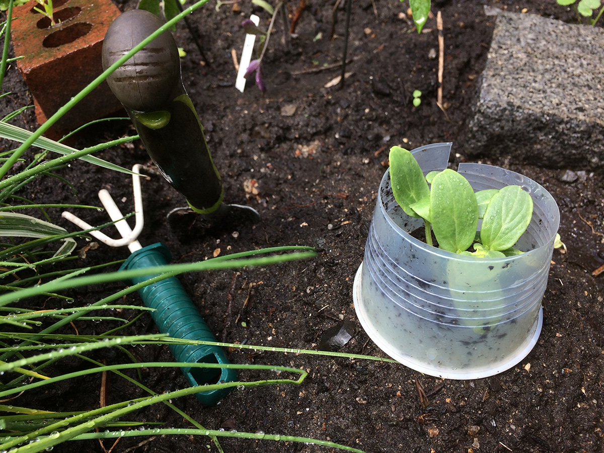i thought the communal garden was empty but there were two women working their respective plots. i didn't recognize either one, but while working we casually said hello. i was there to make plastic cup rings for my cucumber and zucchini seedlings. another zucchini seedling had emerged. i also trimmed some lemon balm to clear more space for the rosemary plant behind it. i watered everything before i left, the sun starting to come out.