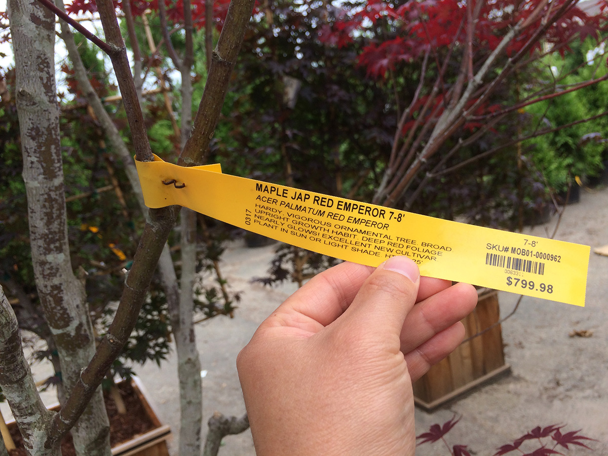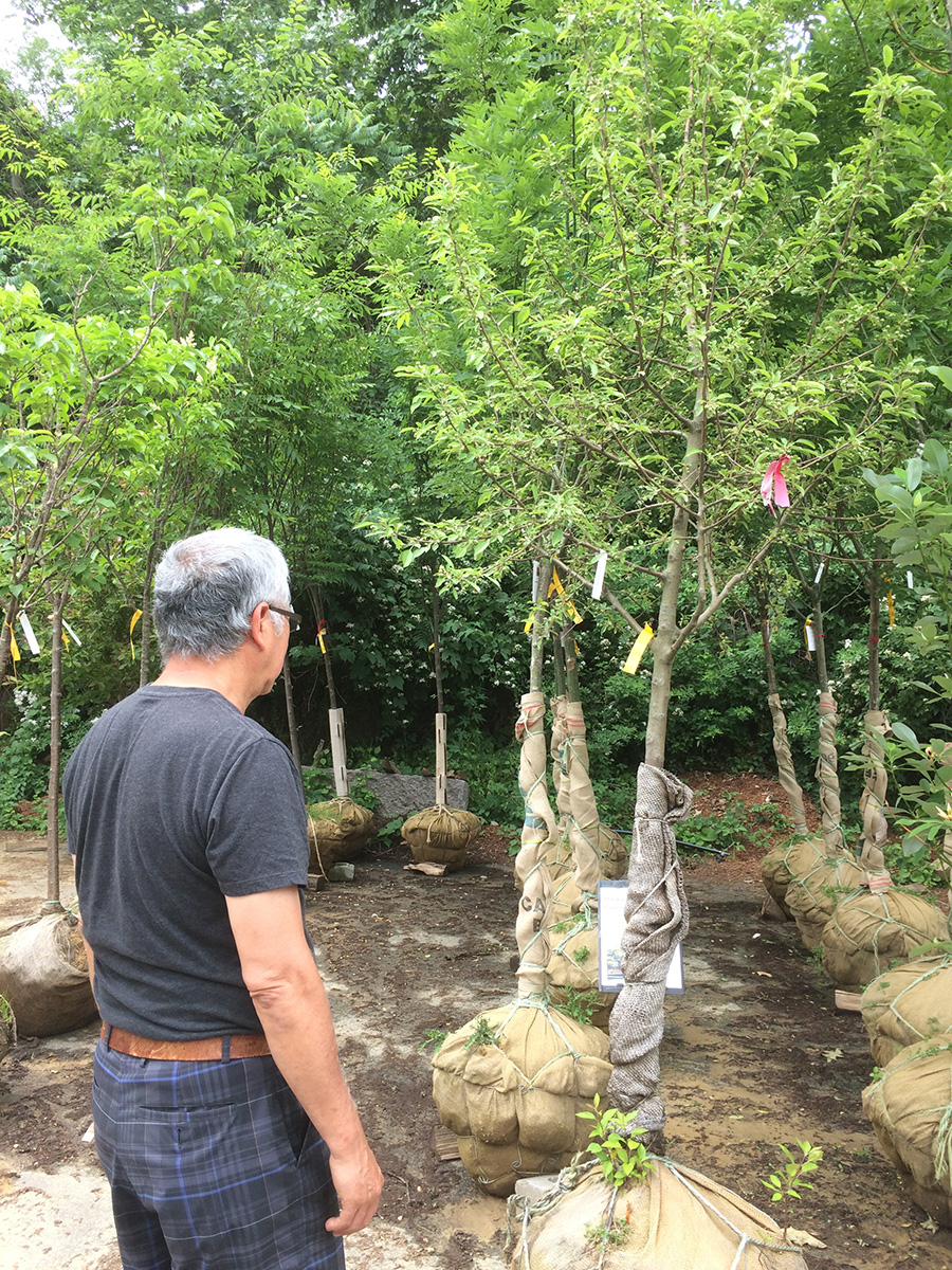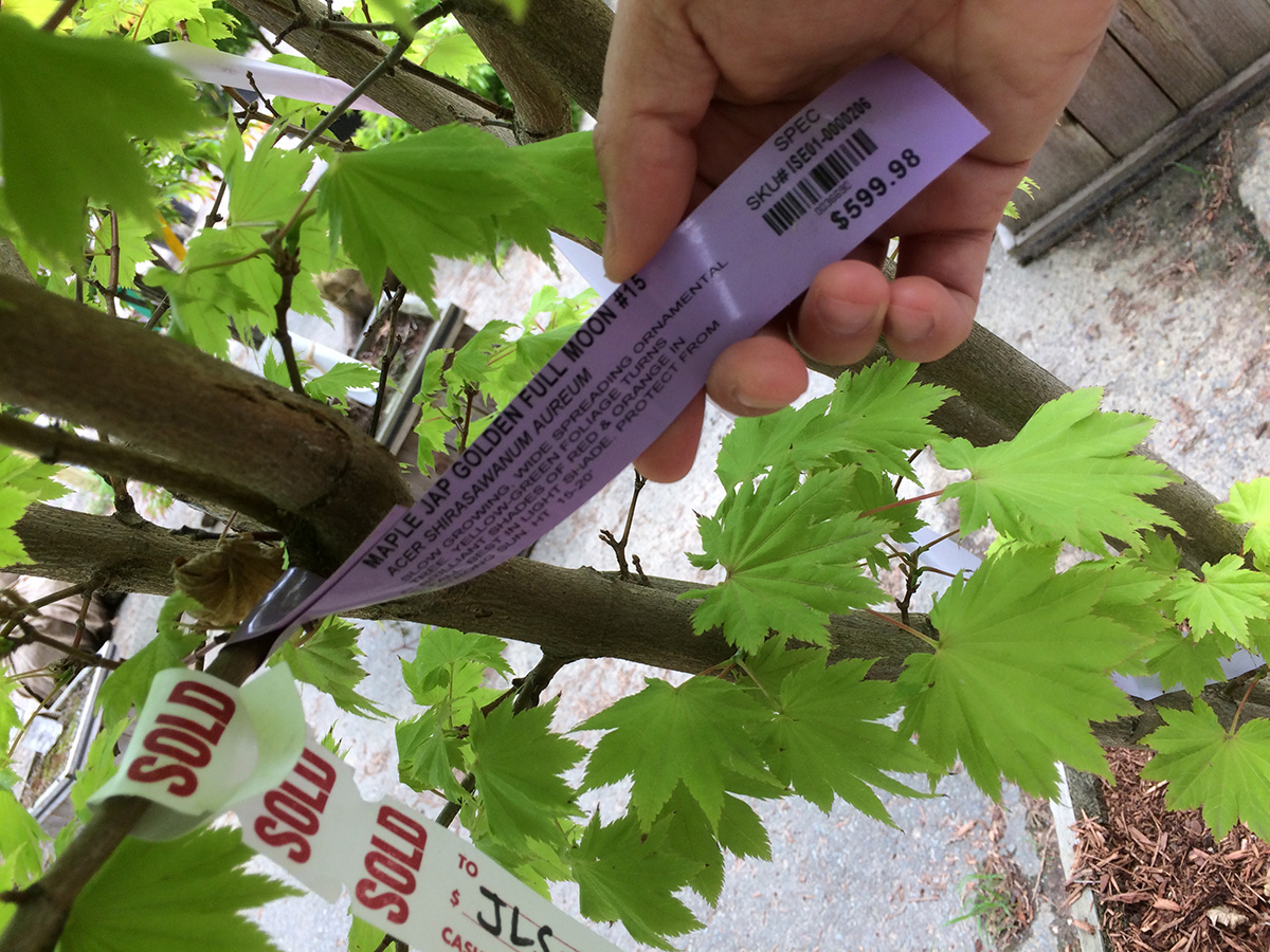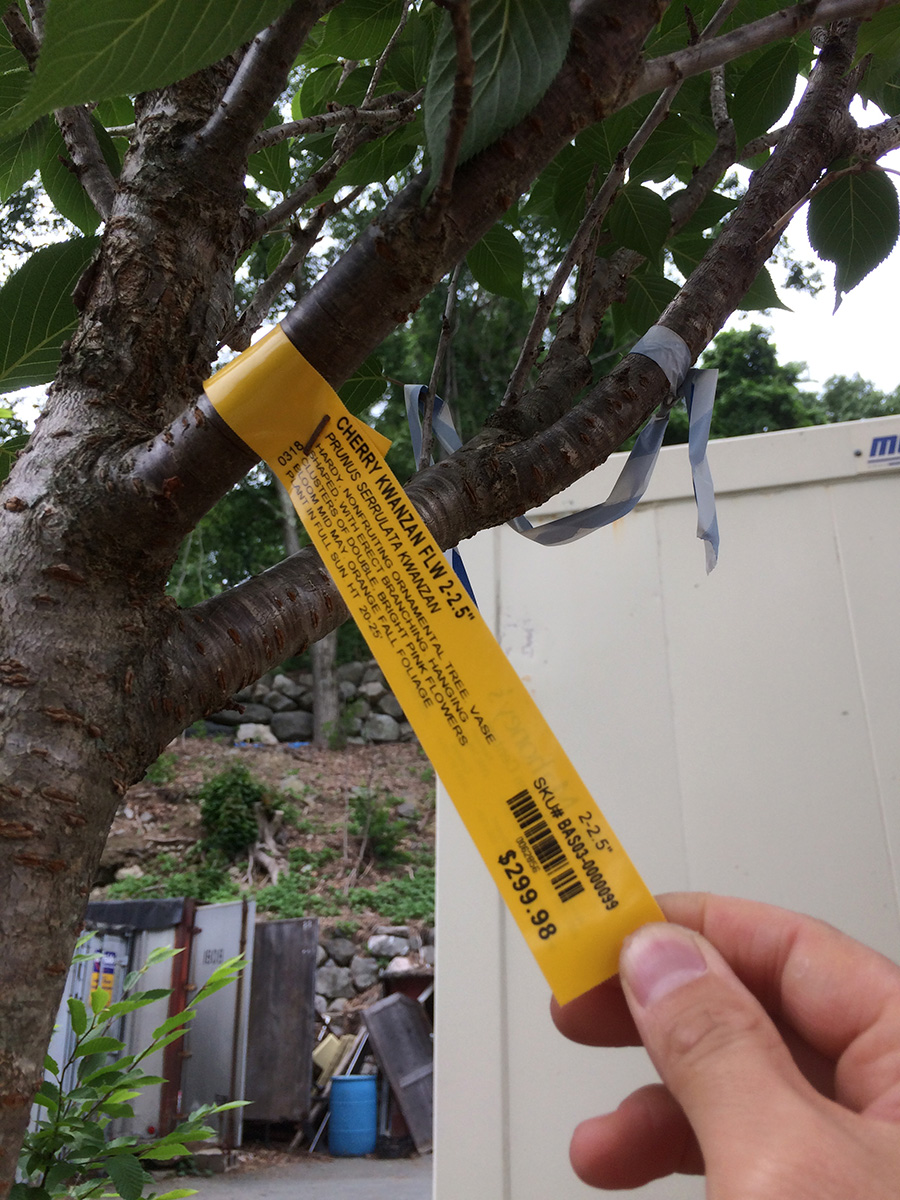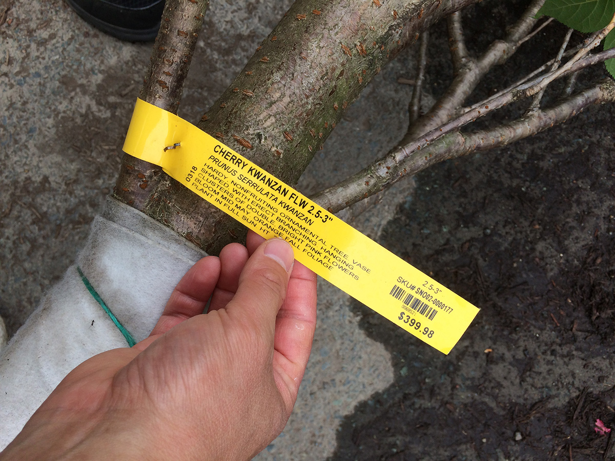 i wasn't confident we'd find any kwanzan flowering cherries, but we actually saw three specimens. one of them was a 10 ft tree selling for $300; given the size, it didn't seem like a bad deal. unfortunately it was already sold, but like the maple i saw earlier, the owner must've forgotten about it to the point where it was already sending out suckers from the root balls and leafing out from the bottom as well. we did find another kwanzan of similar height and price, but the reason why it wasn't sold because it looked diseased (cracked bark). the third kwanzan we found was also available, but it was easily 15-20 ft, and the wind had toppled it to the ground. it was only $400 which seemed like a bargain, but the cost to transport/plant a tree of that size would easily double the price, so another reason why nobody wanted it. there were also a lot of yoshino cherries, but they have pale pink-white flowers which we don't like.