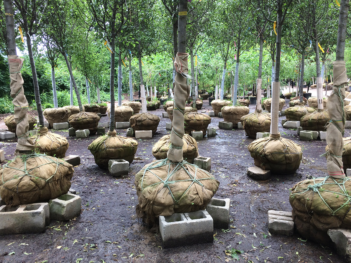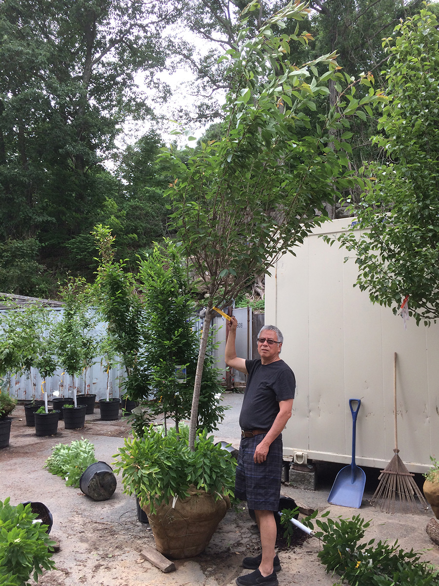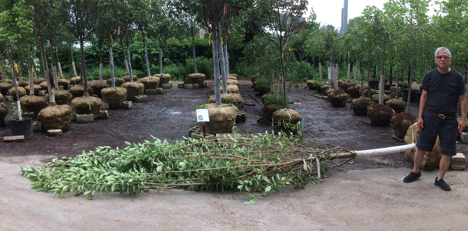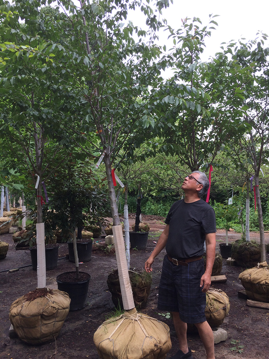 i wasn't confident we'd find any kwanzan flowering cherries, but we actually saw three specimens. one of them was a 10 ft tree selling for $300; given the size, it didn't seem like a bad deal. unfortunately it was already sold, but like the maple i saw earlier, the owner must've forgotten about it to the point where it was already sending out suckers from the root balls and leafing out from the bottom as well. we did find another kwanzan of similar height and price, but the reason why it wasn't sold because it looked diseased (cracked bark). the third kwanzan we found was also available, but it was easily 15-20 ft, and the wind had toppled it to the ground. it was only $400 which seemed like a bargain, but the cost to transport/plant a tree of that size would easily double the price, so another reason why nobody wanted it. there were also a lot of yoshino cherries, but they have pale pink-white flowers which we don't like.
