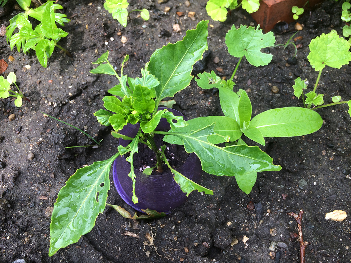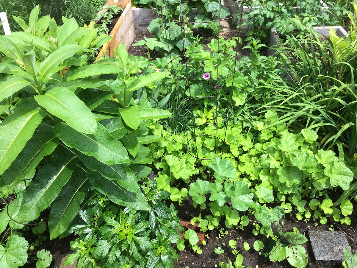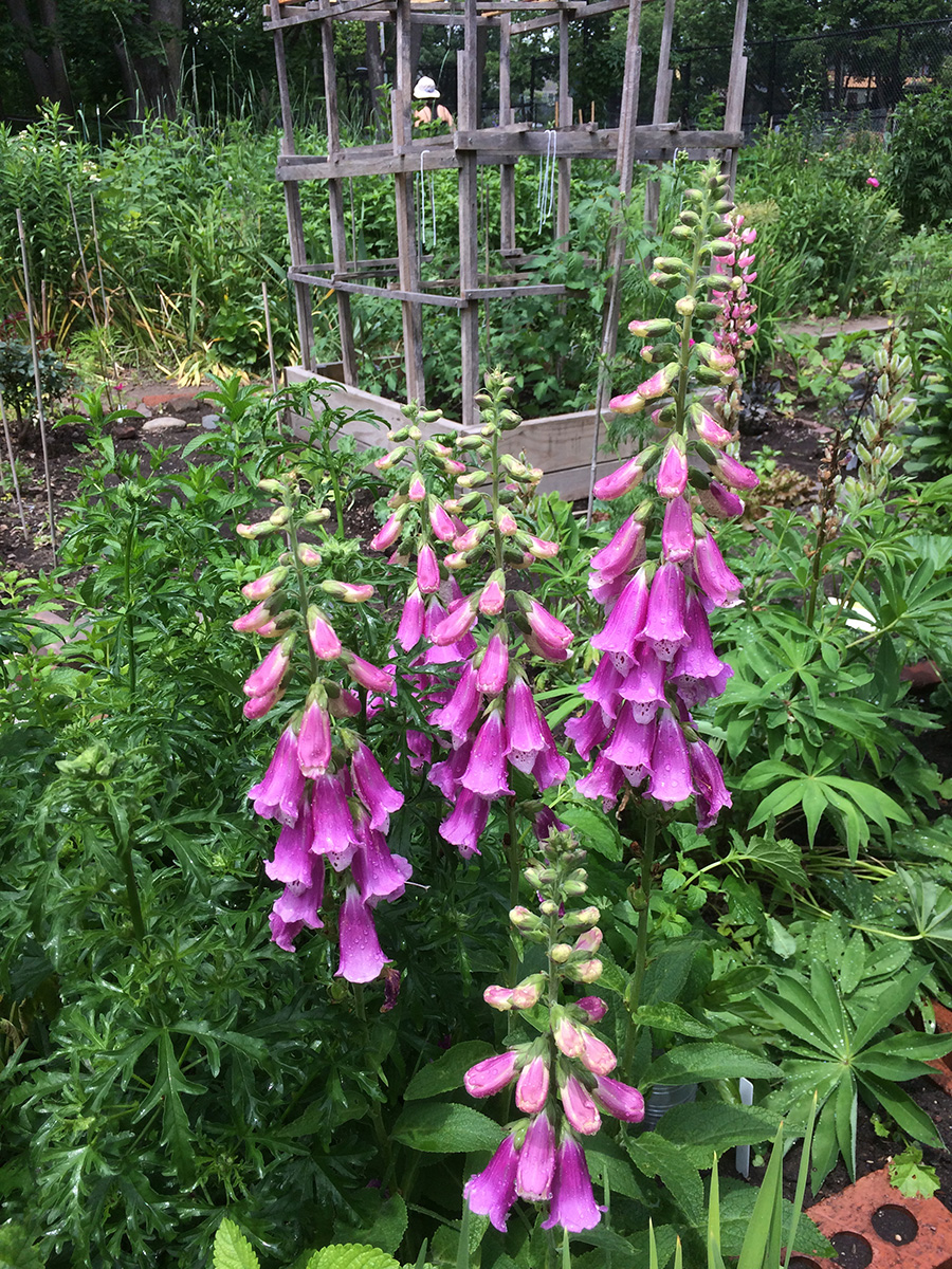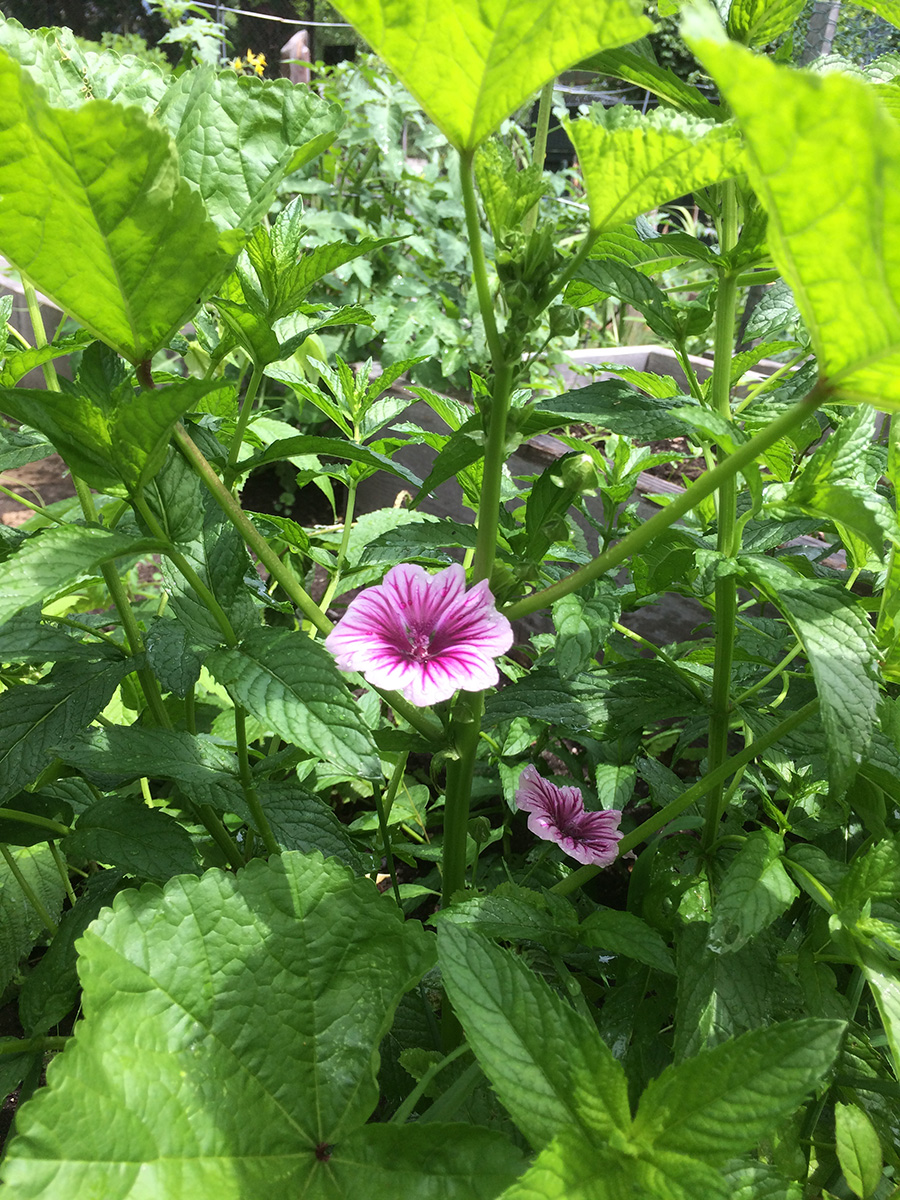after watering the front and back yard, i grabbed my things and motorcycled to the community garden to do some watering, leaving directly to belmont afterwards. i was surprised to find a few striped mallow flowers; this is just a sneak preview as i have plenty of plants so eventually my garden will just be covered with these flowers. there was also another gardener there, a woman whom i didn't recognize working one of the shady northwestern plots. neither one of us made an effort to say hello. she seemed to be doing some heavy duty terraforming, making frequent trips to the shed to gather different tools.