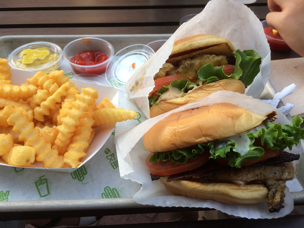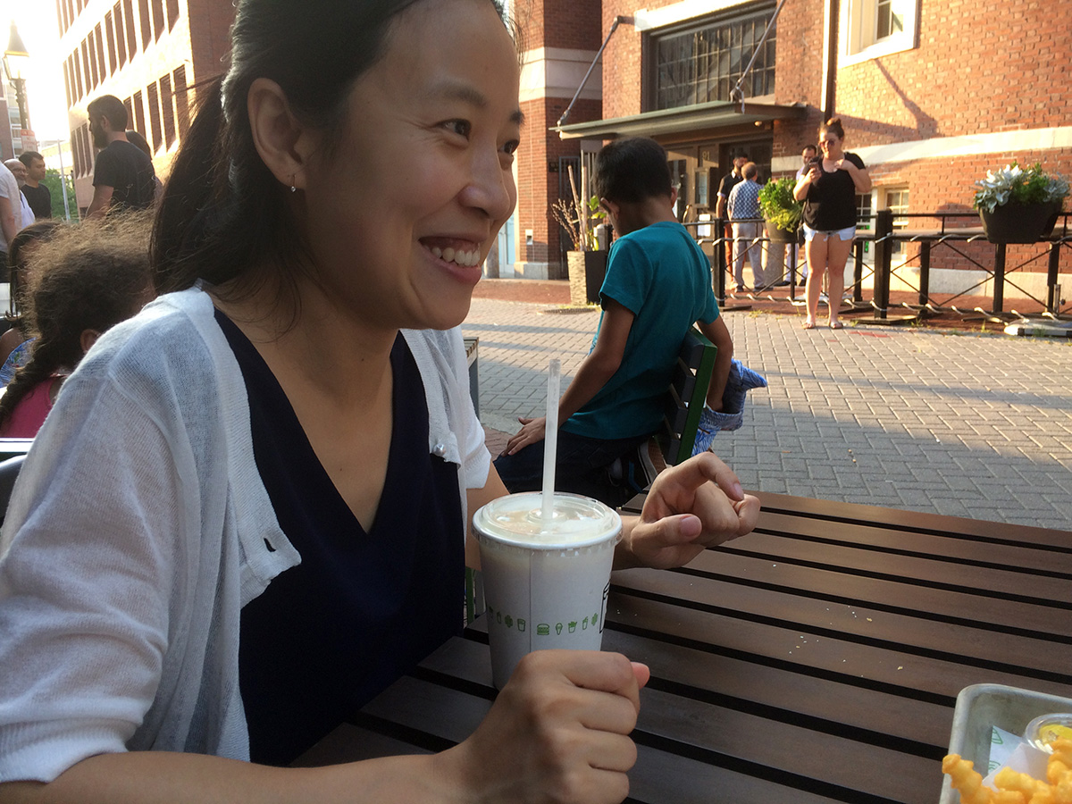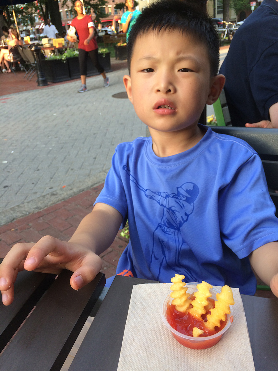 we continued on our way to harvard square. thomas was complaining about wanting some water. if he doesn't get his way he pretty much throws a tantrum and doesn't stop. i finally gave him some water from my tumbler, which kept him quiet for a few minutes before he started complaining about water again. we went to the shake shack to get some shakes and burgers. they didn't seem to have water, so wangyang bought a bottle for $2.45 (expensive water). later we discovered they did have free water, we just didn't see it. that finally kept thomas quiet for the time being.