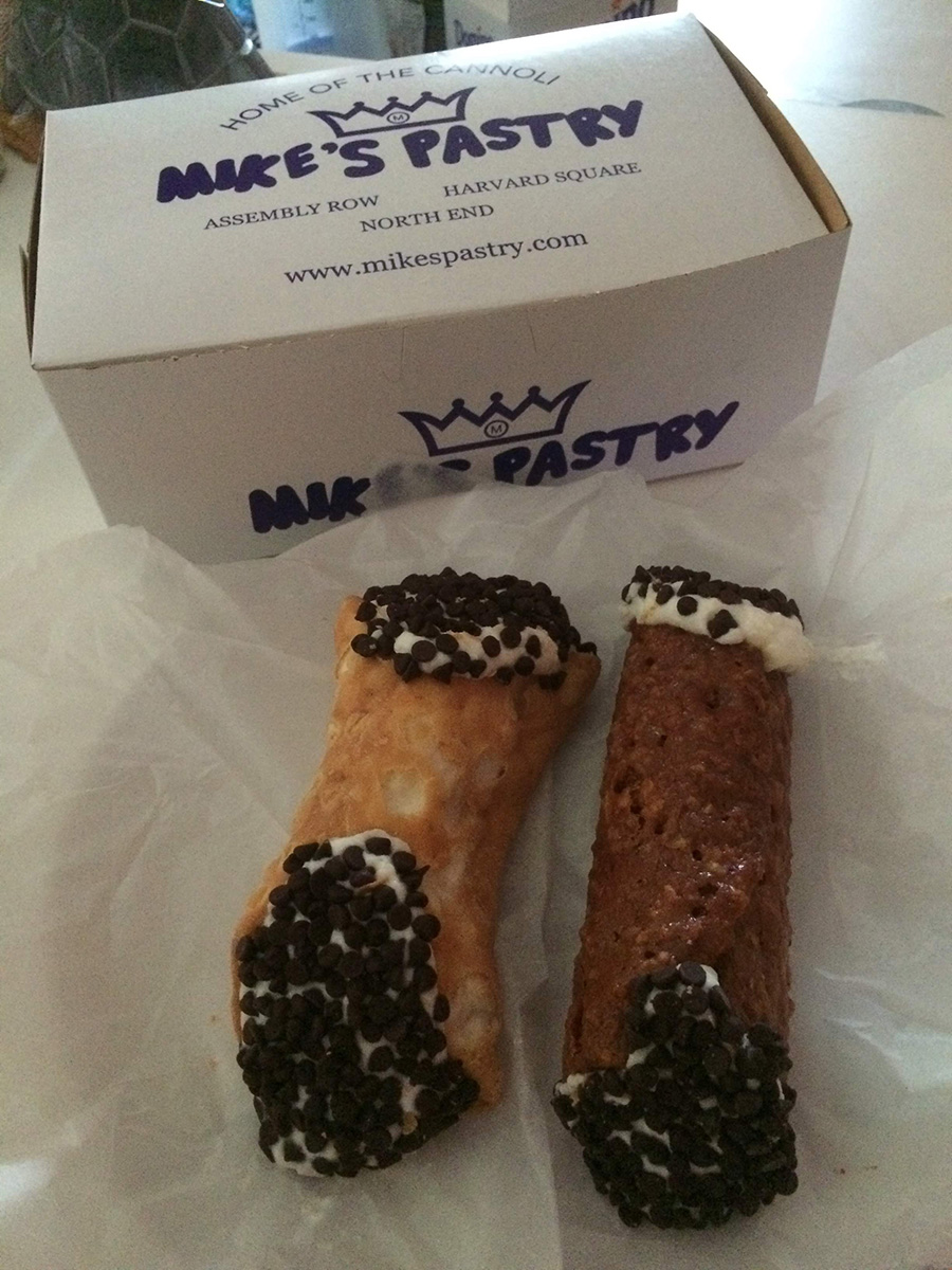 when we got to harvard yard, thomas didn't want to get his photo taken with the harvard statue and wandered off (pretending to run away, but like the chickenshit that he is, always within eyesight of us), while i took a quick snapshot for wangyang. i dropped them at the coop while i left for the pastry shop. there was a handful of indecisive tourists inside the store, and two bored employees waiting for them to make an order. i bought a regular cannoli and a mocha cannoli ($4 each) and left with their eponymous box.
