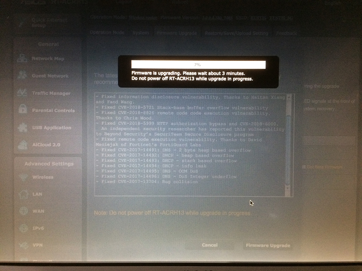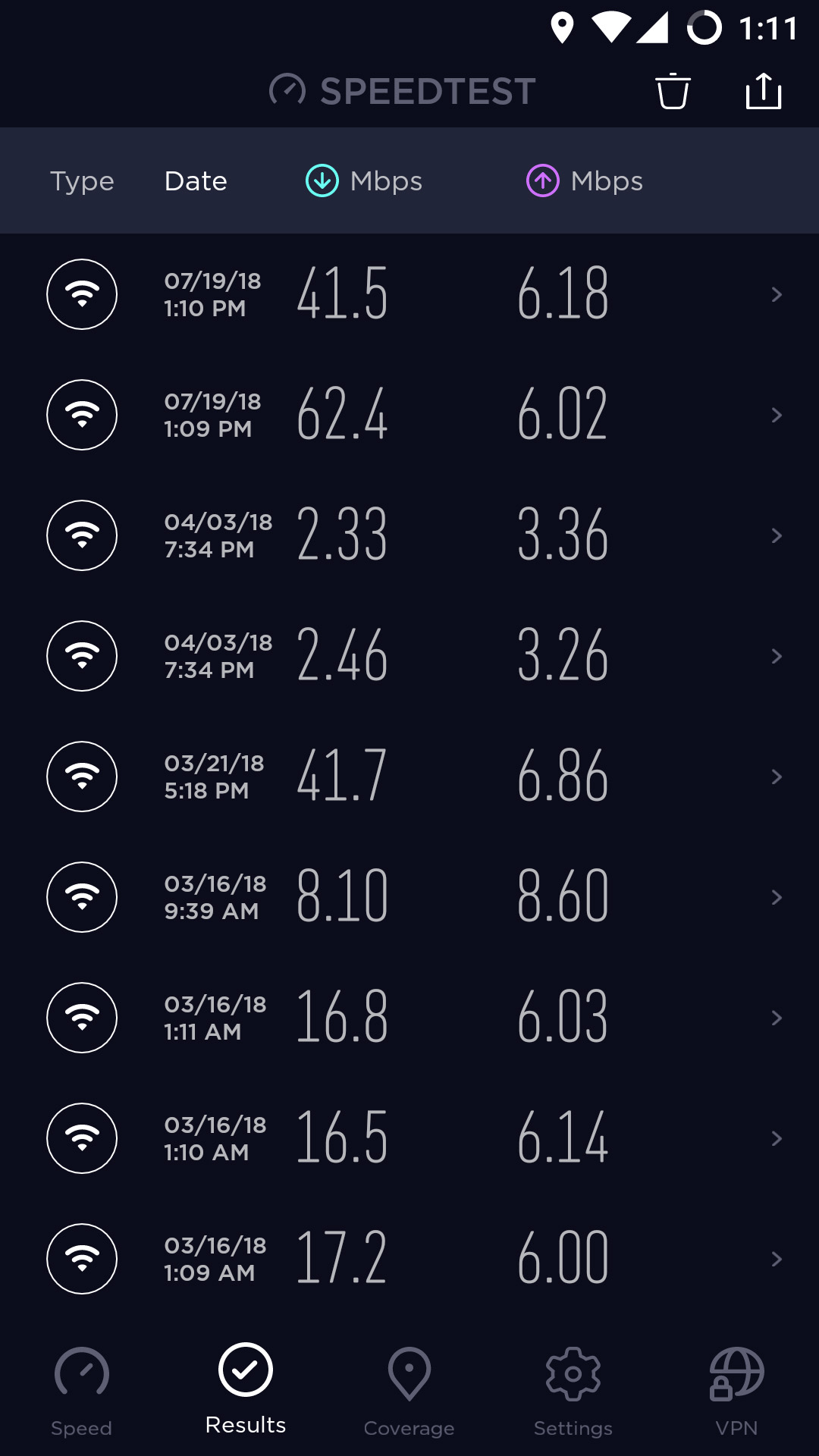 i spent the rest of the afternoon playing with the asus router. first i copied down all the static addresses and forwarding ports for all my raspberry pi devices and one webcam from the old TP-Link TL-WR841ND v9 router with DD-WRT. while looking through the settings, i saw it had NoCatSplash, a captive portal feature. i'll look into it some other time. next i swapped out the old router with the new asus router. first thing i did was to update the firmware. i noticed that the asus is configured for 192.168.50.xx, but all my previous routers had been on the 192.168.1.xx network, so i changed it to what i know. the RT-ARCH13 doesn't have as many features as the asus RT-AC68U router at my sister's place, but we're talking a 3x price difference and you get what you pay for. but for what it is, the RT-ARCH13 is good enough. it has dual-band 2.4GHz and 5GHz and i was curious to try the faster speed to see just how fast it really is. using speedtest.net, 2.4GHz 40Mbps/8Mbps (download/upload), while 5GHz gave me upwards of 60Mbps/8Mbps (the maximum speed i pay for through comcast), so there really is a difference.