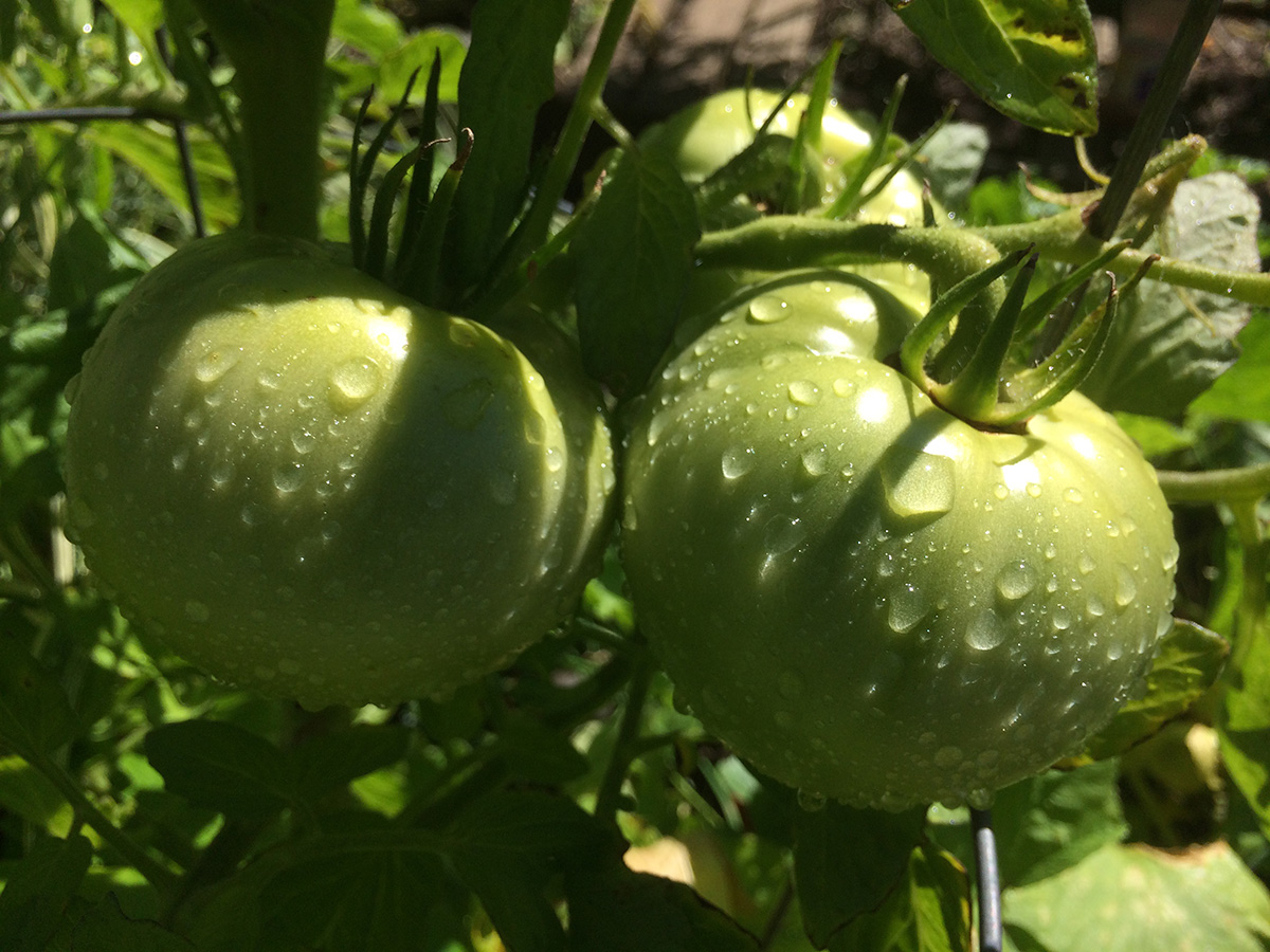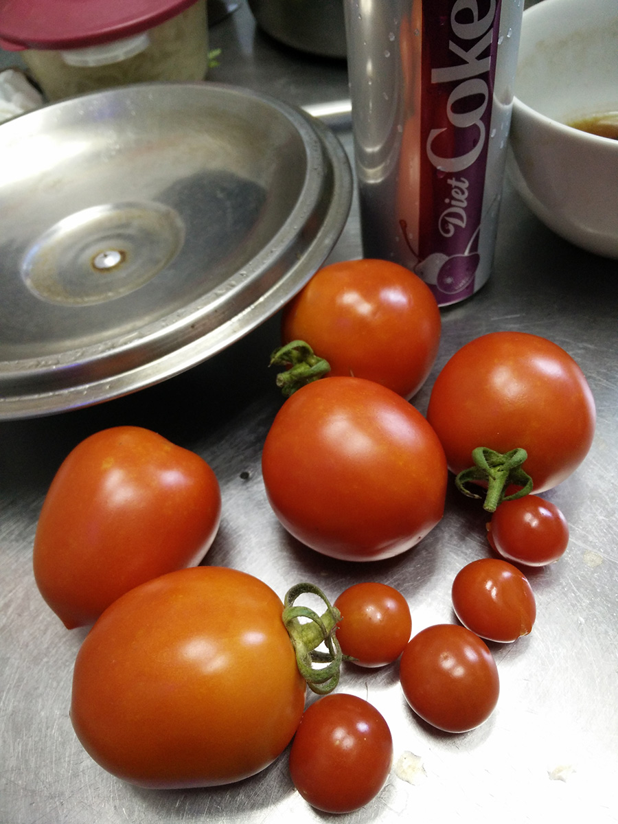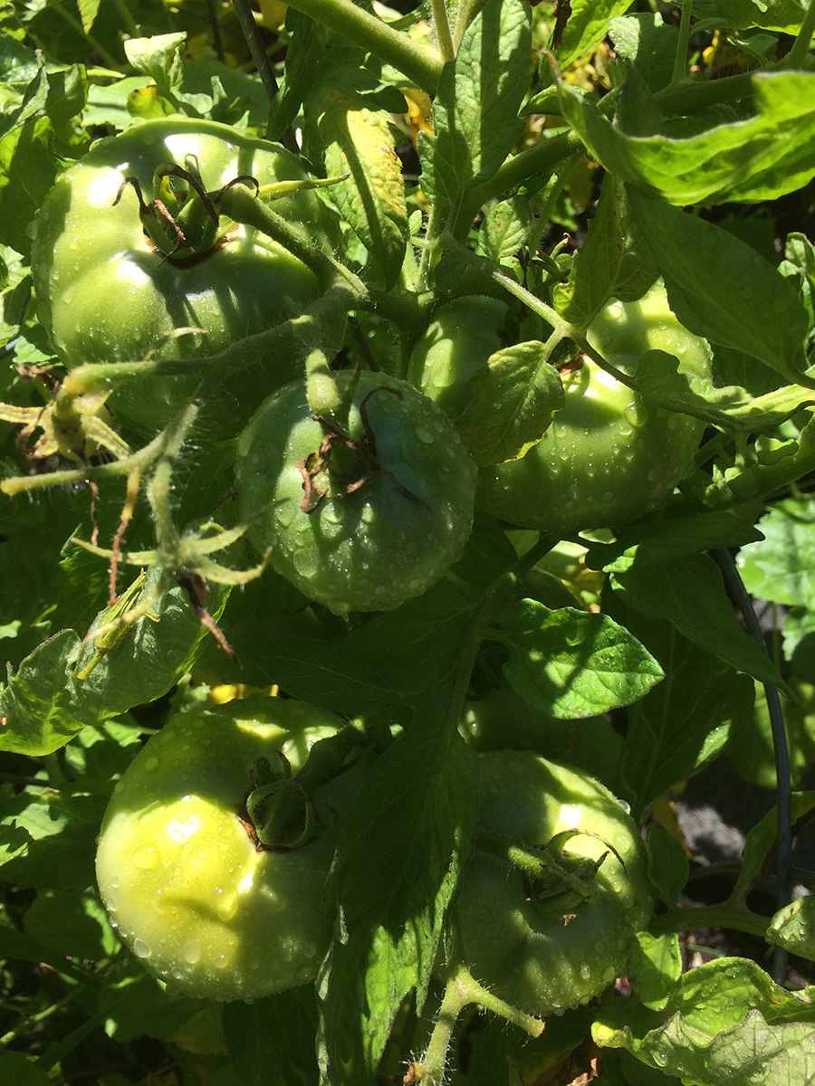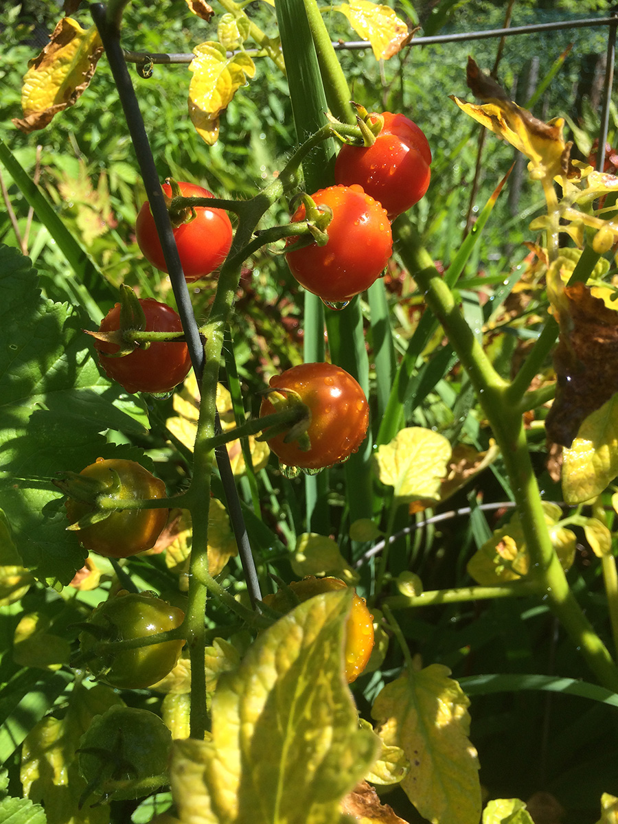 while i was at it i also watered the common bed in front. while watering renee's plot, i admired some pretty flowers she had growing. it took me a while to figure out that wasn't her plot: her garden is more of an opened mess, a combination of haphazardly growing cherry tomatoes, some basil, and a lot of weeds. only afterwards did i water my own garden. it probably wasn't that necessary, since the garden is so lush at this point, any amount of moisture automatically gets captured. i also did some light weeding and collected a few tomatoes. there was nobody else there, the temperature today so hot and humid none of the other gardeners would venture out except me.