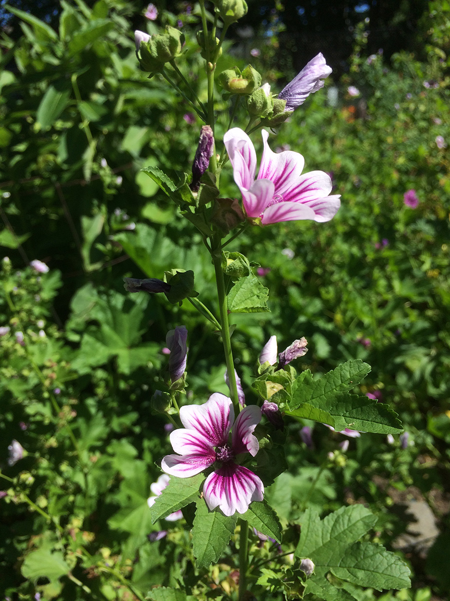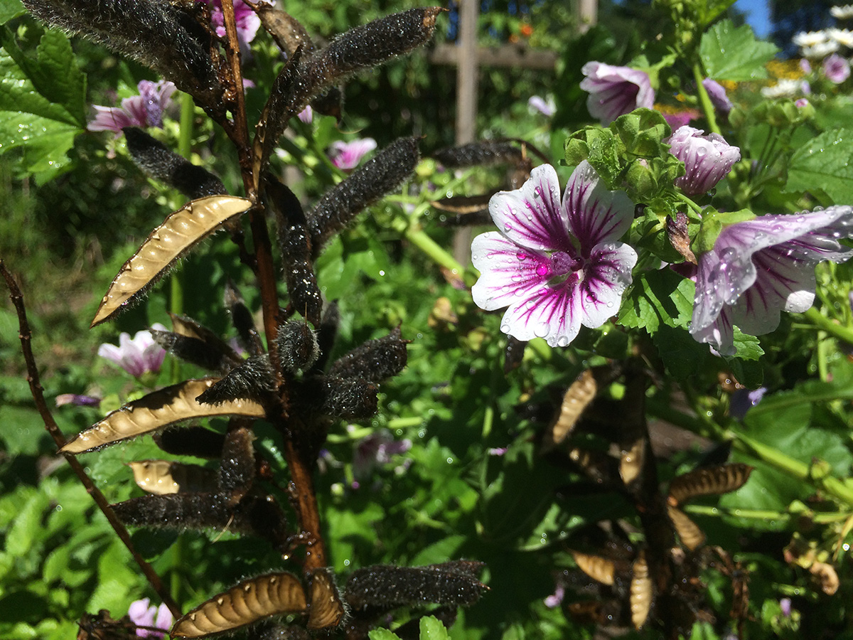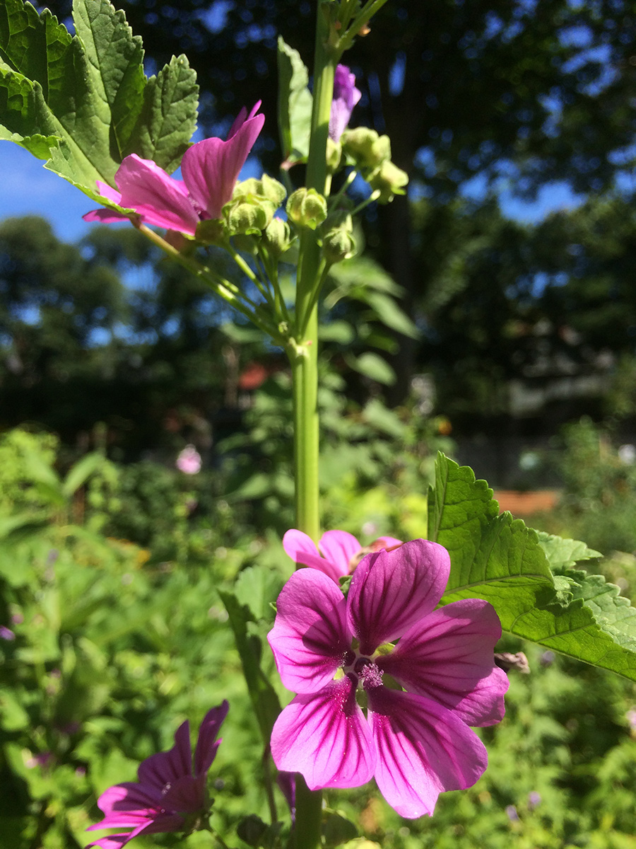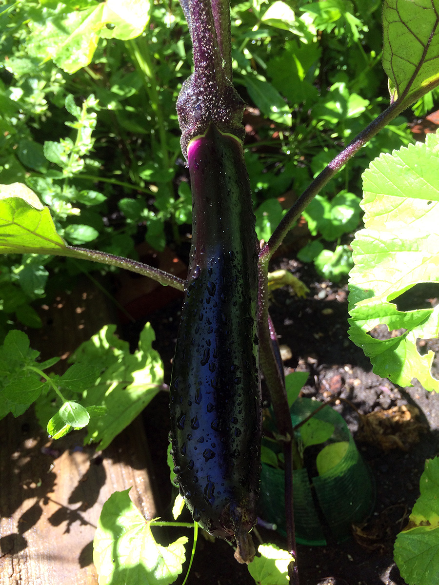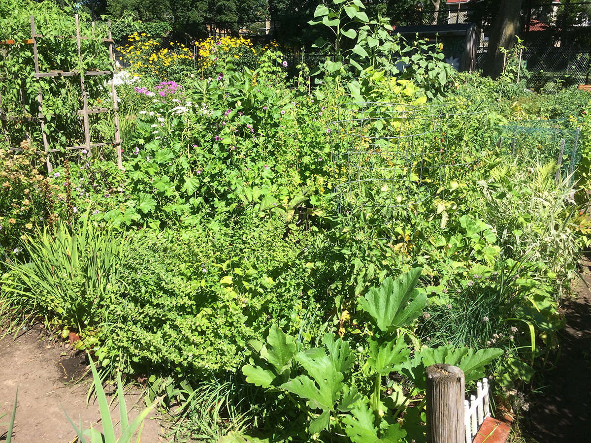 while i was at it i also watered the common bed in front. while watering renee's plot, i admired some pretty flowers she had growing. it took me a while to figure out that wasn't her plot: her garden is more of an opened mess, a combination of haphazardly growing cherry tomatoes, some basil, and a lot of weeds. only afterwards did i water my own garden. it probably wasn't that necessary, since the garden is so lush at this point, any amount of moisture automatically gets captured. i also did some light weeding and collected a few tomatoes. there was nobody else there, the temperature today so hot and humid none of the other gardeners would venture out except me.