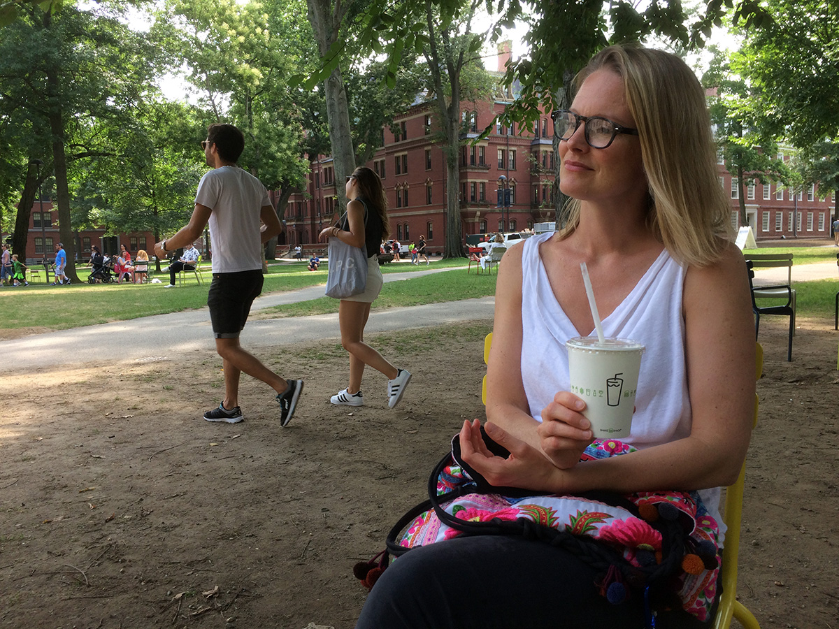 eliza showed up a bit before noontime. we chatted for about half an hour before relocating to the kitchen to make some lunch. i've always been jealous of eliza's perfect vision, so i was surprised when she pulled out a pair of glasses to read the latest issue of entertainment weekly. afterwards we walked down to harvard square to get some shakes at the shake shack, drinking them in harvard yard. we began walking back to the house sometime after 2:30pm, so she'd have time to get back to westwood to pick up theo from camp.