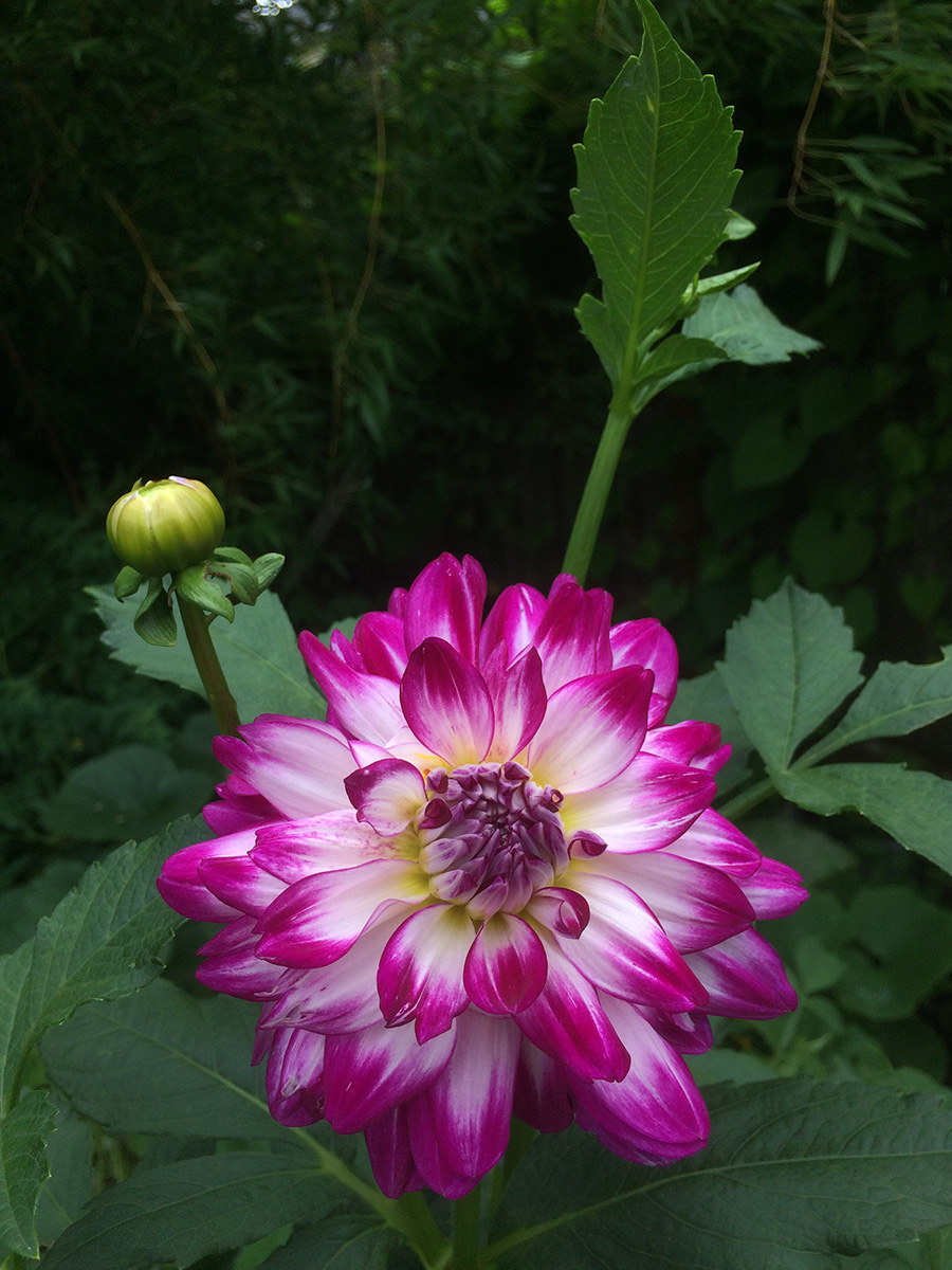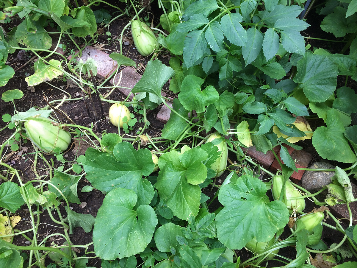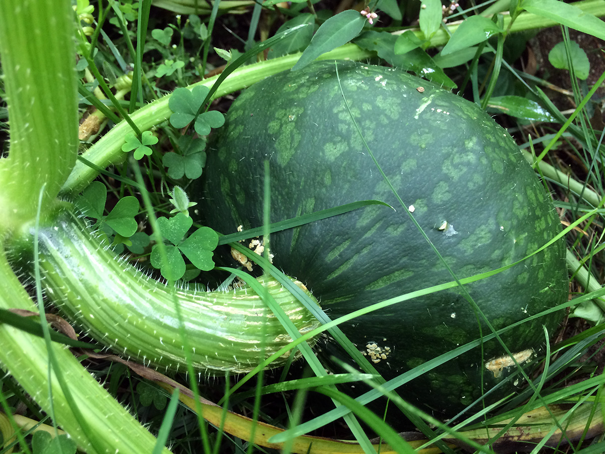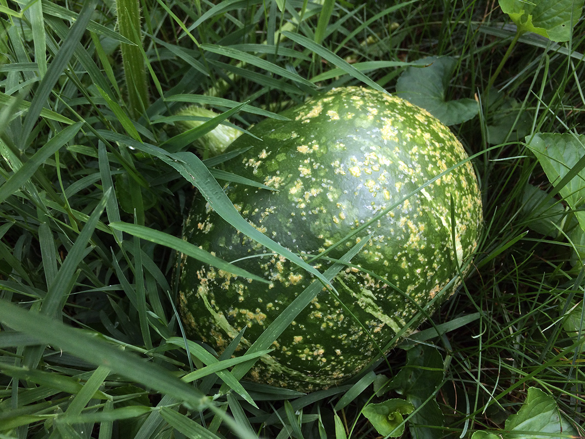 the dahlias are finally blooming. the flowers are large, about the diameter of a grapefruit, and kind of resemble peony flowers, just with no fragrance. i've never grown dahlias before, i don't know what the big attractions are besides large late season flowers. these are from my sister's garden anyway, so i see it more as an extension of her flowers. the melons are squashes growing in the recently opened perennial bed are doing well. my father cut back a lot of the dead foliage on the korean melons, revealing several large fruits.
