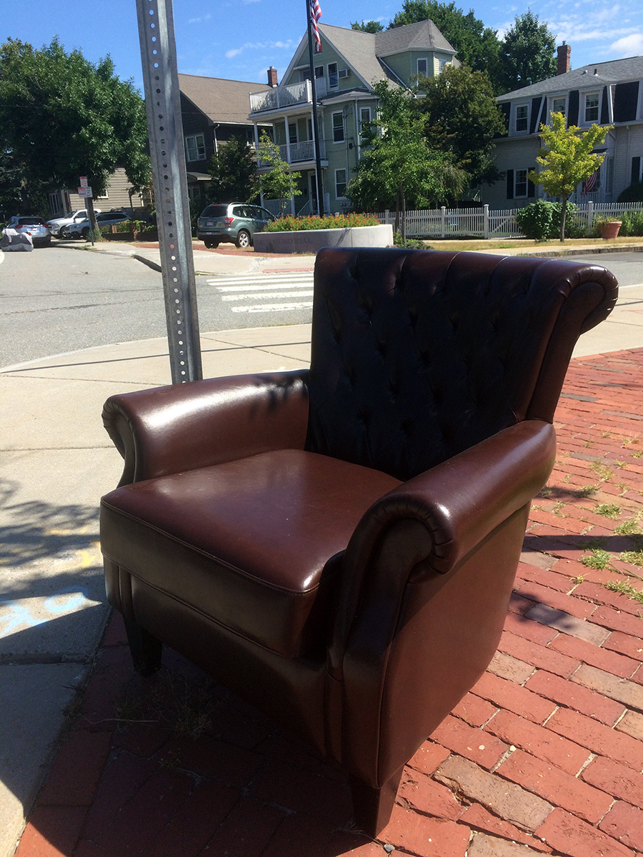 i then rode back to belmont to drop them off so my father wouldn't have to wait until tomorrow to test the DBJ-1 antenna. i'd seen a faux leather sofa chair opposite glacken field earlier, and stopped to snap a photo and check it out. when i got to belmont, i told my parents about it and my father and i drove out to pick it up. it was in pretty good condition, not a style i like, but sits comfortably. my mother's been searching for a decent living room chair after the cushions on her own chair have sagged to the point where it needed replacing. she tried the new chair but didn't like it, sits too high, she can't even put her feet on the ground. so the search continues.