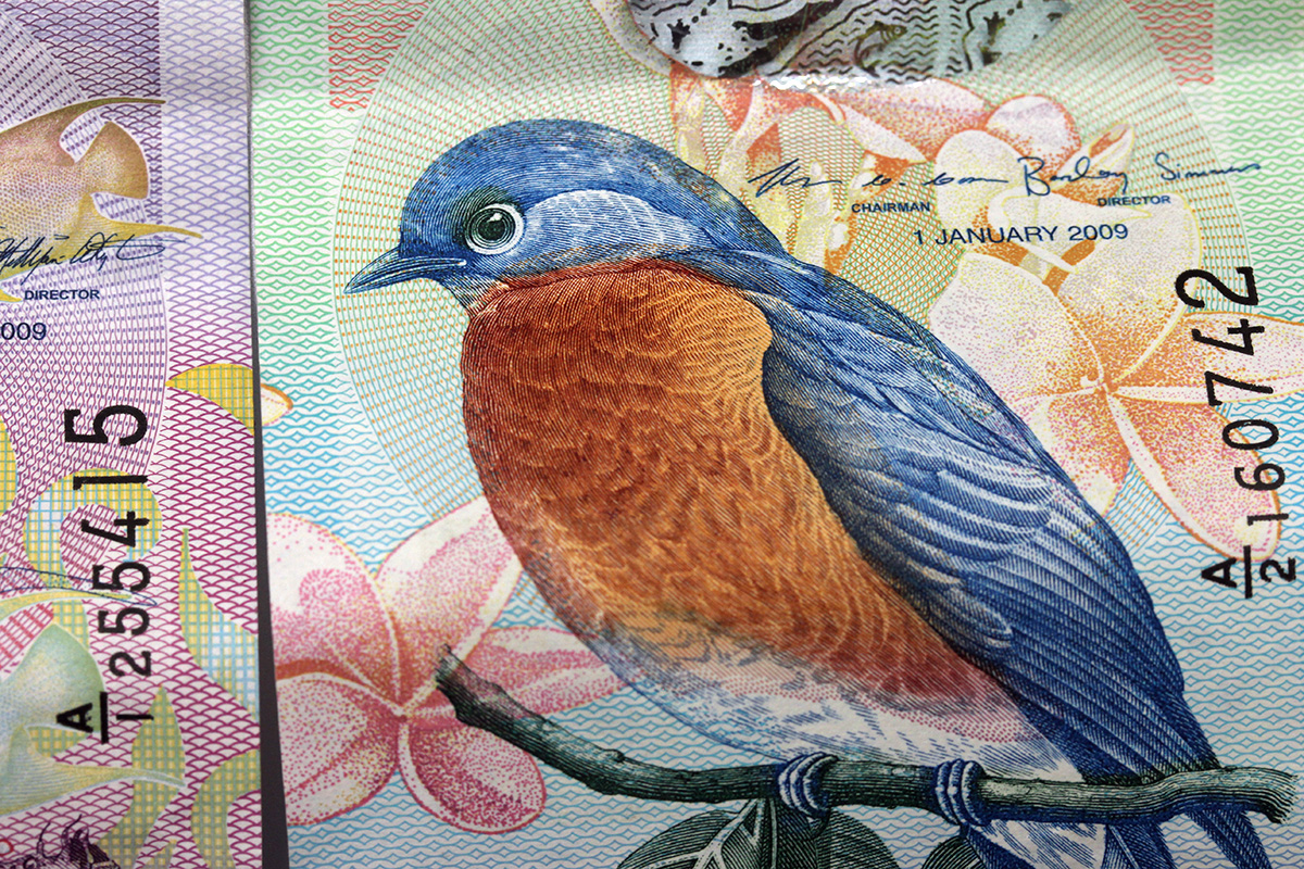 the only souvenirs my parents brought back for me were some bermuda money. the bermudan $2 features the bluebird, which is not actually native to bermuda, but so many of bermuda's natural wildlife were destroyed centuries ago, so now the introduced bluebird is considered a native species.