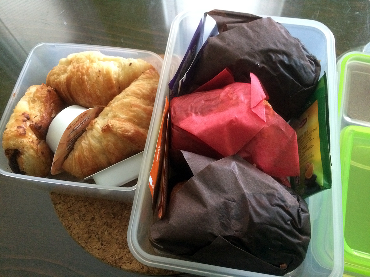 we stopped off at the cafe first, where my father dropped my mother cafe. my 2nd aunt was working today, so the shop was already open. afterwards my father gave me a ride back to my place, along with a few containers of cruise boat breakfast food they managed to smuggled out. i had a muffin along with a miniature croissant.