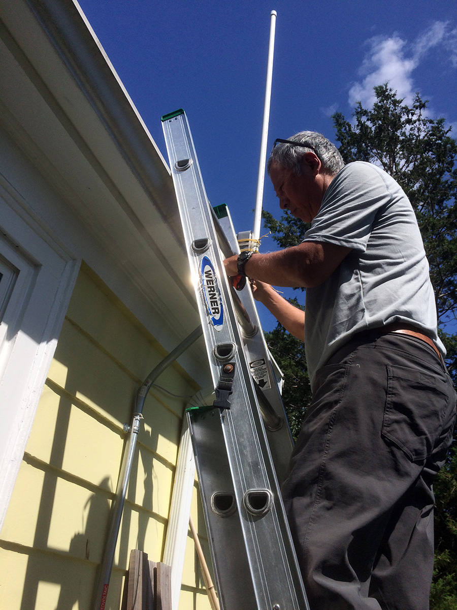 my father hooked up the SWR meter with the length of working coaxial cable to test out the DBJ-1 antenna. SWR is good (1.0) on the low end of the UHF and VHF spectrum, but gets as high as 2.0 on the upper end. reception wasn't that good, we could barely hit many of the local repeaters that we can receive with ease with our DIY ground plane antenna. i think one problem might be the location of the DBJ-1 antenna, which is just above the gutter, while the homemade ground plane sits high on the chimney. to properly test it we'll need to mount the DBJ-1 higher, but we'll need a longer feed cable.