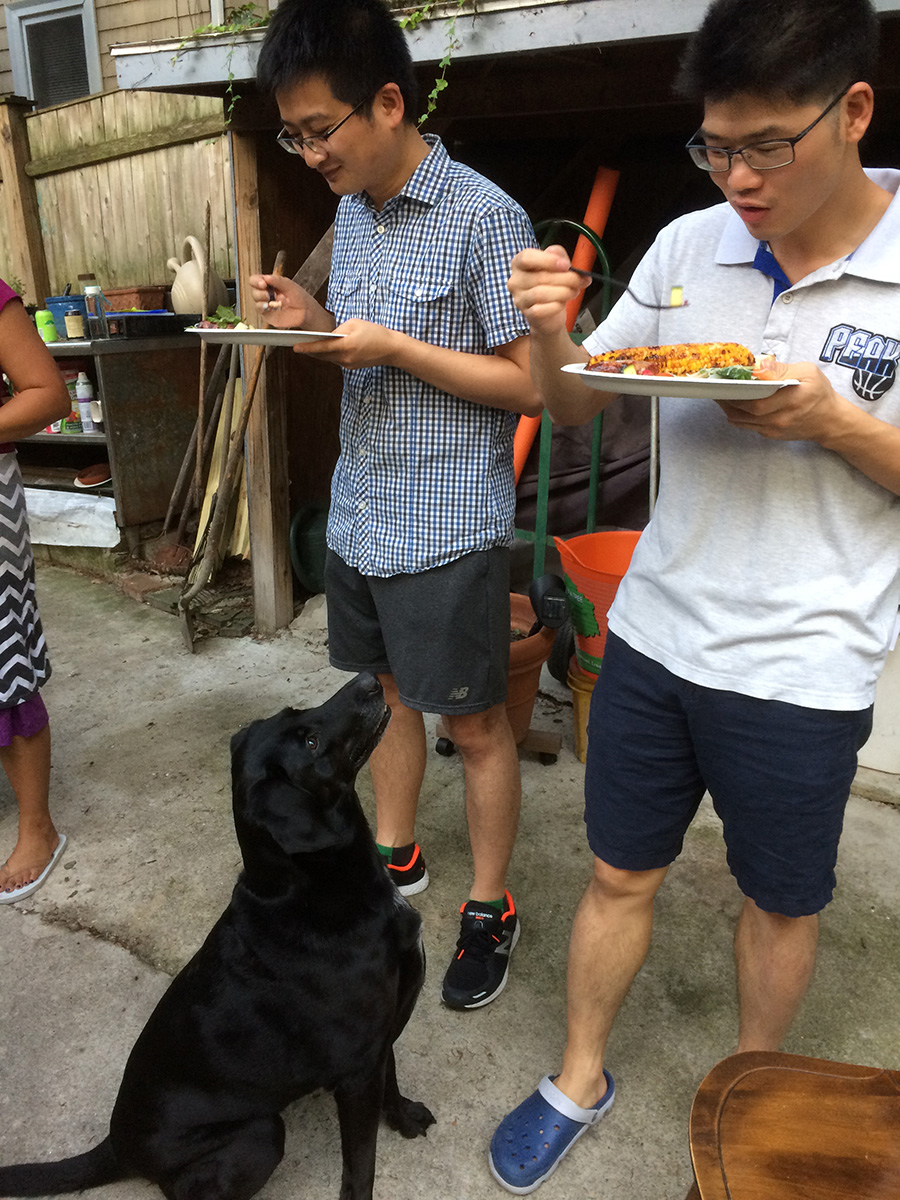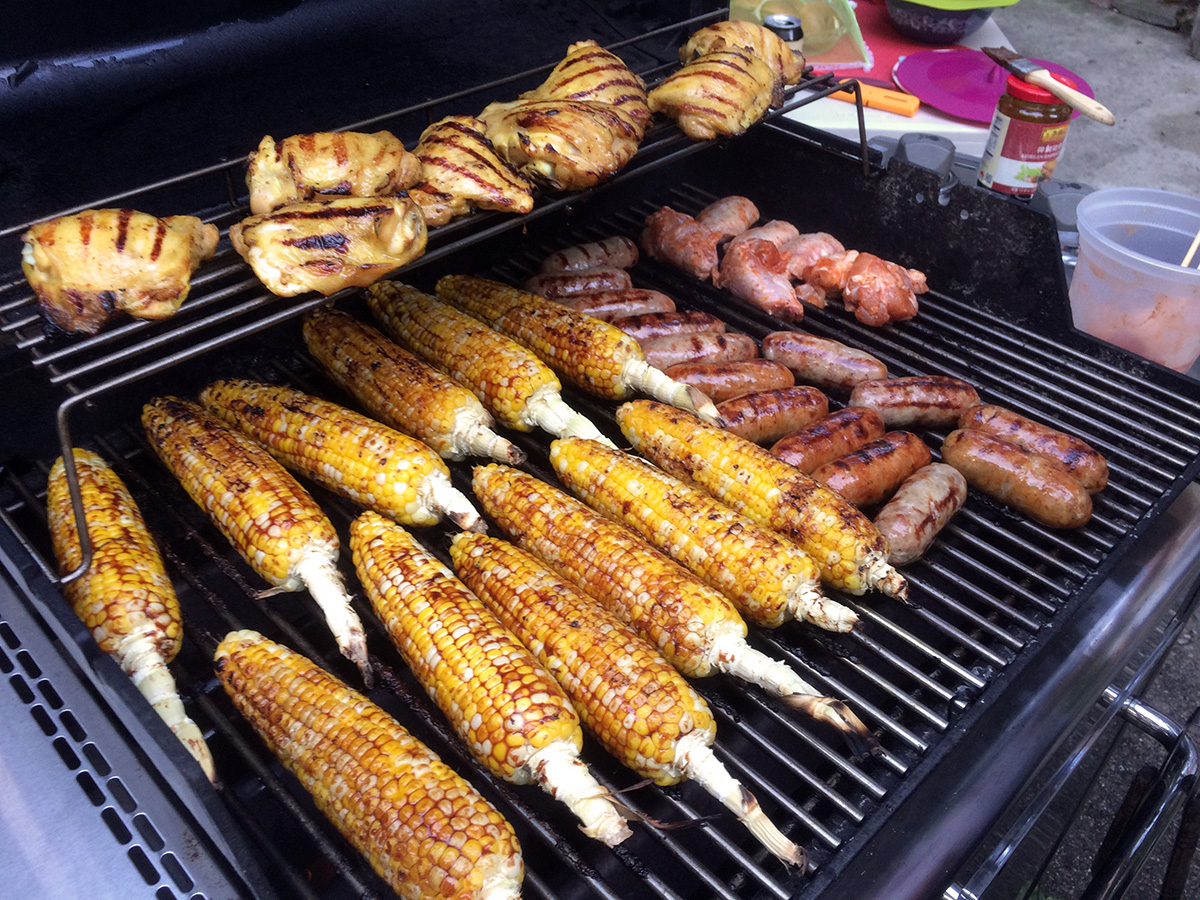 the 2 astrophysicists living upstairs come down around 6:30pm, just when we were about to finish cooking some of the food. besides the italian sausages and the barbecue corn, we also had chicken. normally barbecued chicken come off the grill tasting a bit raw, but these were cooked to perfection, not sure whether it was the marinade, the type of chicken meat (thigh?), or maybe it was the grill. we also barbecued some wings which were cooked perfectly as well.