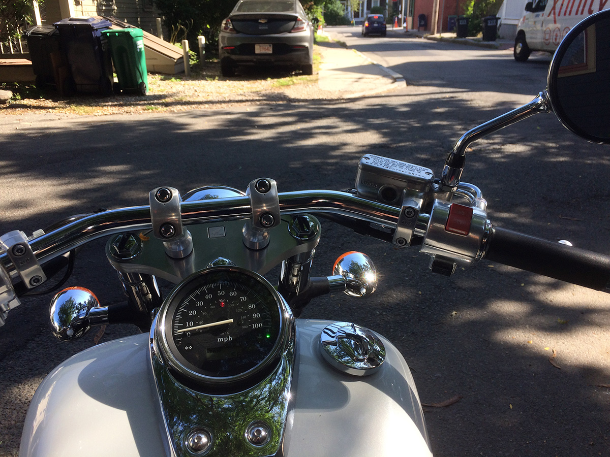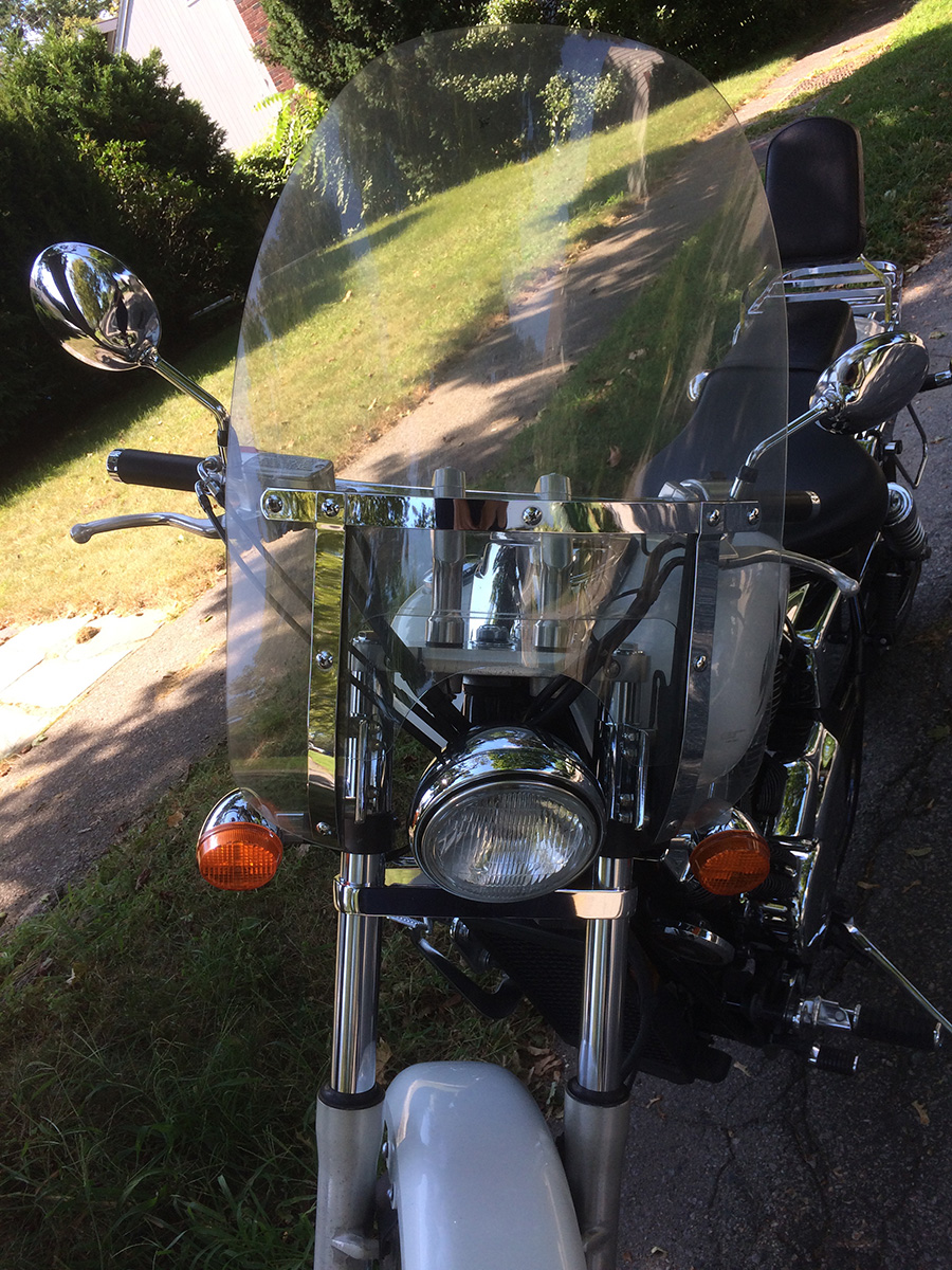 national cycle makes quick-release windshields; unfortunately that's not the one that i have. reattaching the windshield was a little difficult, it's really a two-person job: one person to hold the windshield, the other person to screw in the bolts and spacers. it took a while but i finally got it mounted (using two similar sized combination wrenches, one metric, one english), leaving my t-shirt completely sweat-soaked afterwards from the heat.
