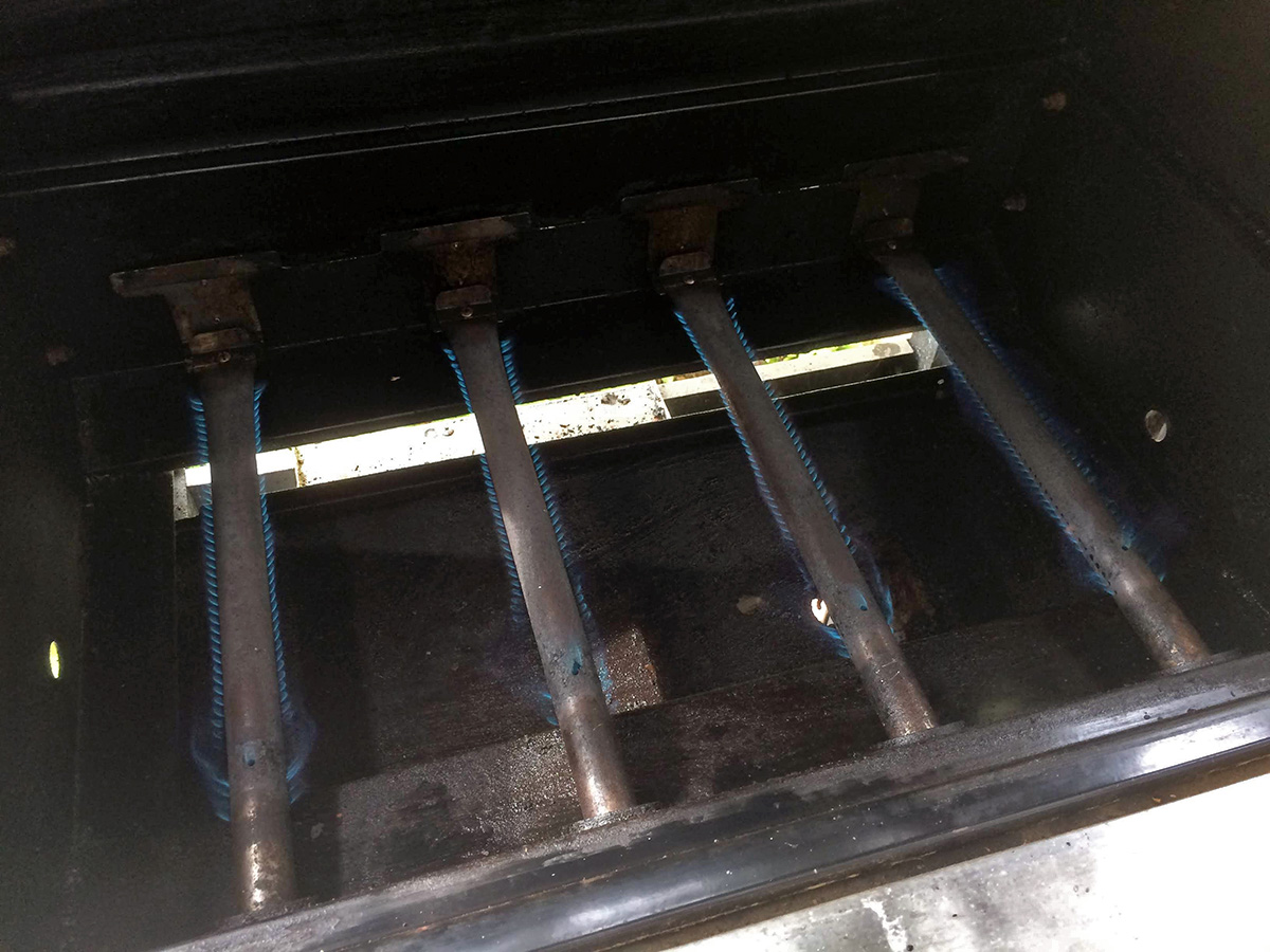 i suggested we put the burners back and lit the grille to see if there were any improvements. it didn't matter that we didn't have any carryover tubes, that just meant we'd need to light each burner individually with a match. we started the grille and the difference was night and day. a few days ago, the burners were mostly orange flames; now it was mostly blue, with just a faint spot of orange near the start of the burners were the carryover tubes would be. this is how we were supposed to be barbecuing! that with that uncontrollable flare ups that charred everything on high heat, but with this nice blue flame and consistent grilling. seeing those beautiful blue flames made me wish we had something to barbecue today. we left the grille on burn off any residue as we put back the burner plates and the cooking grates.