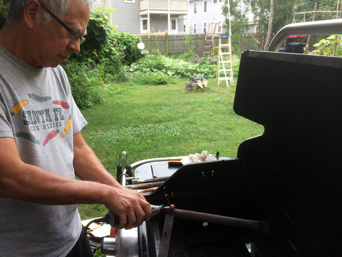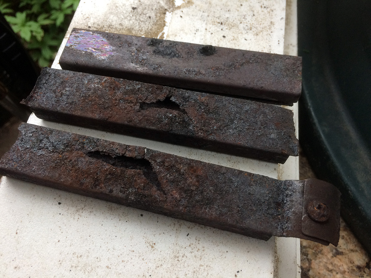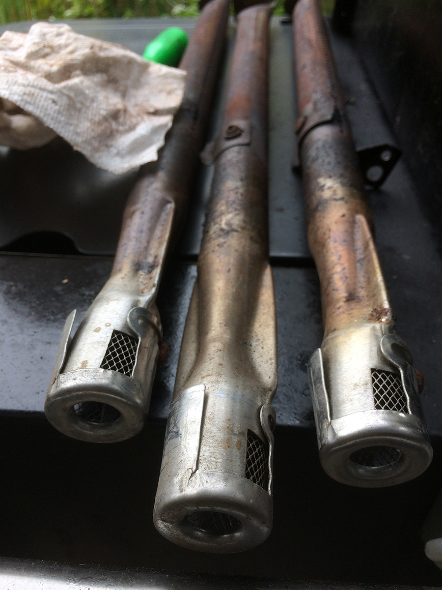 my father and i were outside taking apart the barbecue grill. with the carryover tubes still installed it was impossible to remove the individual burners. my father was going to sand off the heavily corroded attachment screws, but the carryover tubes were so corroded, it didn't take a lot of force to simply break them apart. once that was done, it was a simple matter of lifting out each burners (4). the burners were in pretty good shape, protected by the inverted-V metal plates that sit just above them, barely any corrosion, just some char marks.