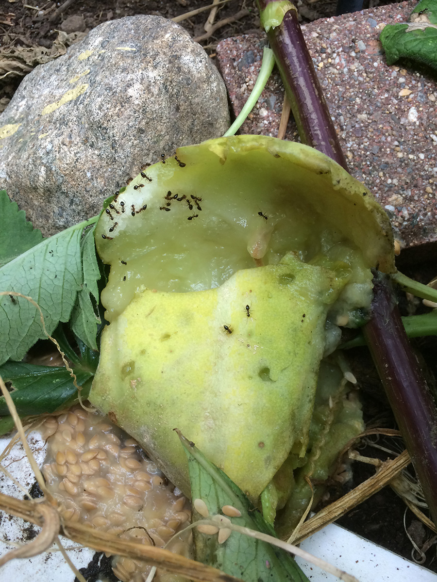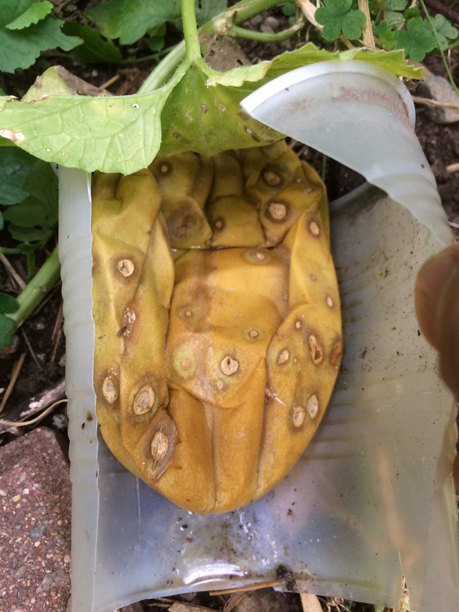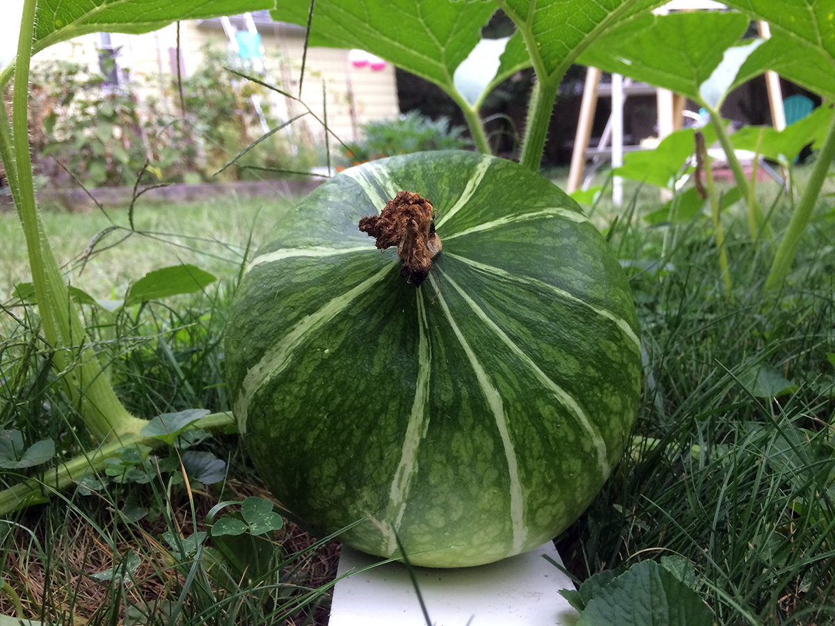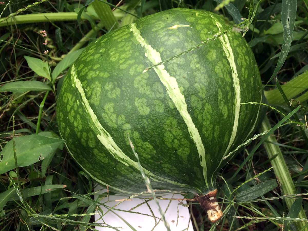 a few korean melons that were fine a week ago have rotted. there seems to be a disease that first appears as spots, but then rots from the inside, resulting in a melon that ruptures at its end. i haven't gone online to do any research regarding this disease, but it only seems to affect the korean melons; the buttercup squash are doing fine, they seem impervious to critters or diseases once they reach a certain size. so impressed with the buttercup performance, but father said we should plant them again next year. the amazing thing is all these buttercup squashes are from a single plant. the main root of that plant has long since rotted (destroyed by vine borers) but auxiliary vines also have the ability to send out roots, thereby keeping the plant alive.