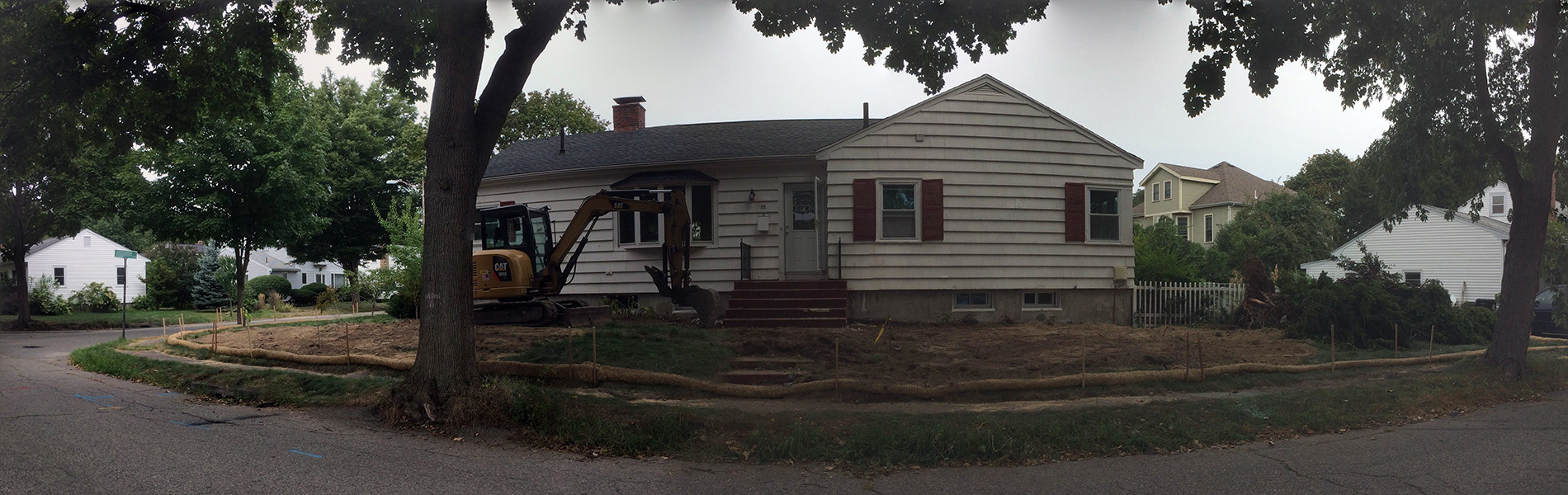 my father told me yesterday that their opposite door neighbors have already started demolition on their house. i saw it for myself for the very first time. there was a small excavator parked on the lawn, now mostly stripped of grass and just dirt. the house still stands, but all the shrubbery around the structure have been chopped down and left in a nearby pile. around the whole perimeter of the property they also put down a rolled up fabric barrier to prevent any leaking construction contaminants from getting onto the sidewalk. i also saw some rat poison traps, which i guess is a requirement for any kind of serious digging project. so far it seems like they're doing it by the book, unlike the grove street chinese garbage mansion.