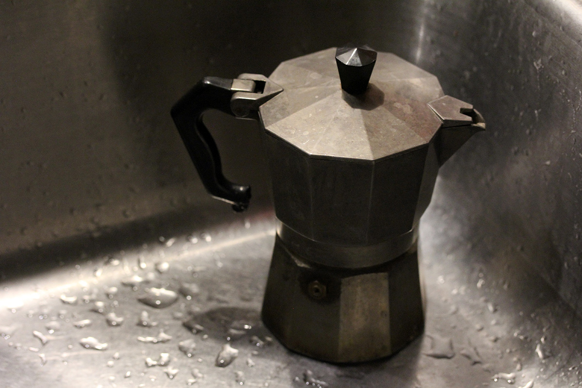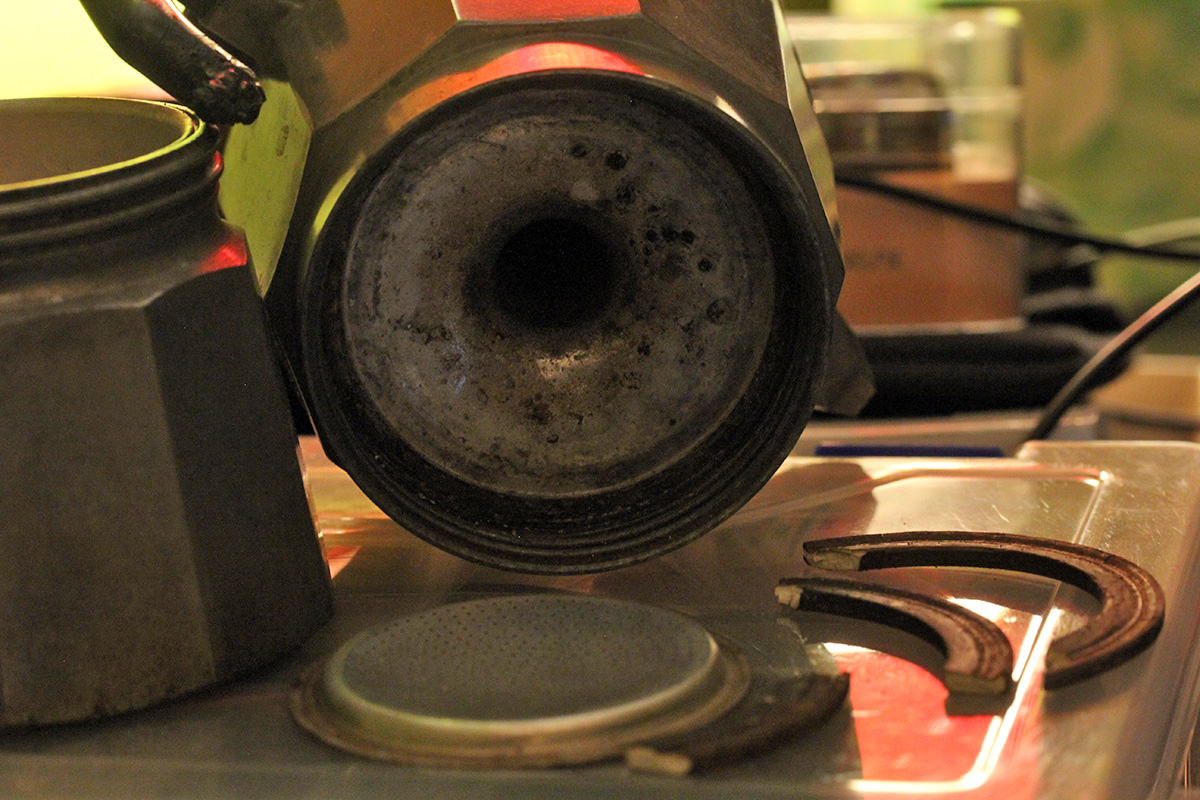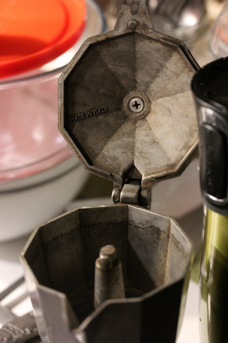 not sure what possessed me, but next i tried cleaning my old moka pot. various coffee drinking roommates have used it. the one who used it the most was italian marco, and he was also the one to melt the plastic handle (i don't mind, it gives me fond memories of his stay). eliza was the last person to use it. she discovered it was leaking from the side, the result of a faulty gasket. not sure why i never replaced it,