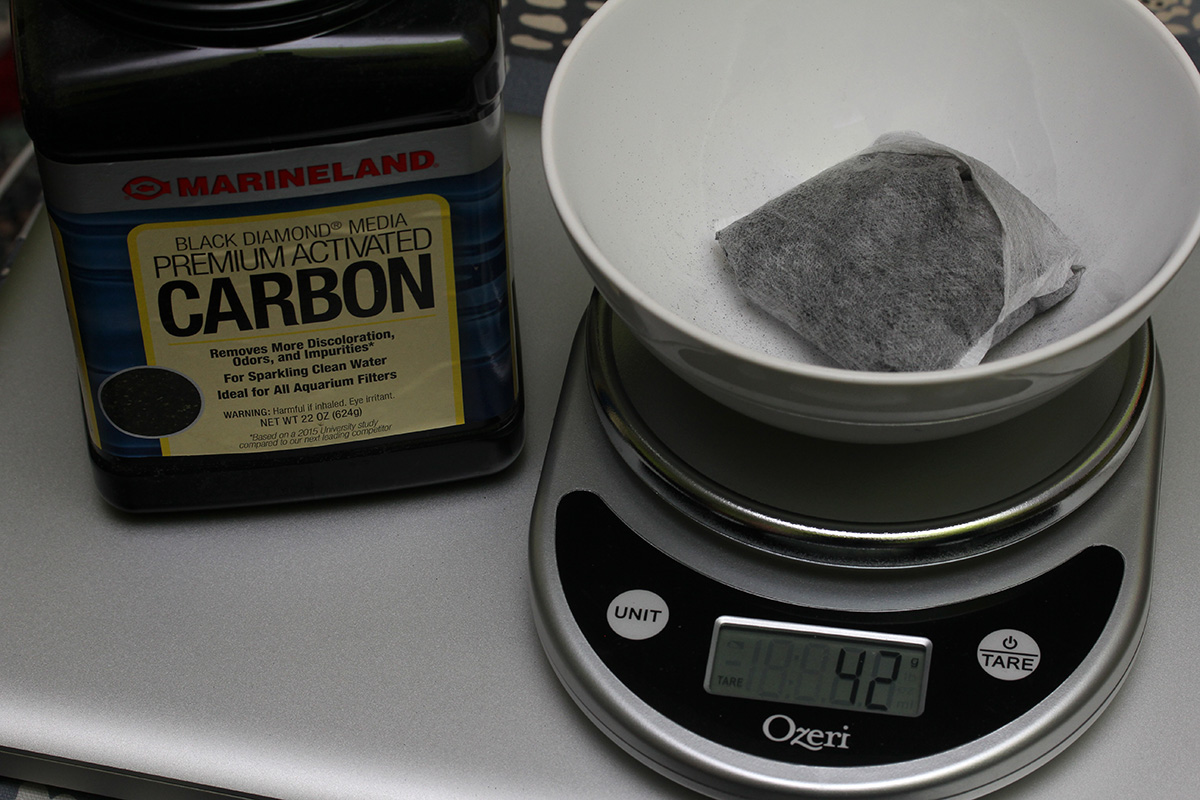 i made myself a new activated carbon insert for my shoes to use as a deodorizer. i made one before but the activated carbon (actually pellets) i used were bad and didn't really seem to do anything. for this new one i used the activated carbon for my aquarium. i know this is good because when i put a grain in water it bubbles up immediately, compared to the pellets which don't do anything. i was trying to measure out 50g but the teabag filter i was using could only hold 42g.