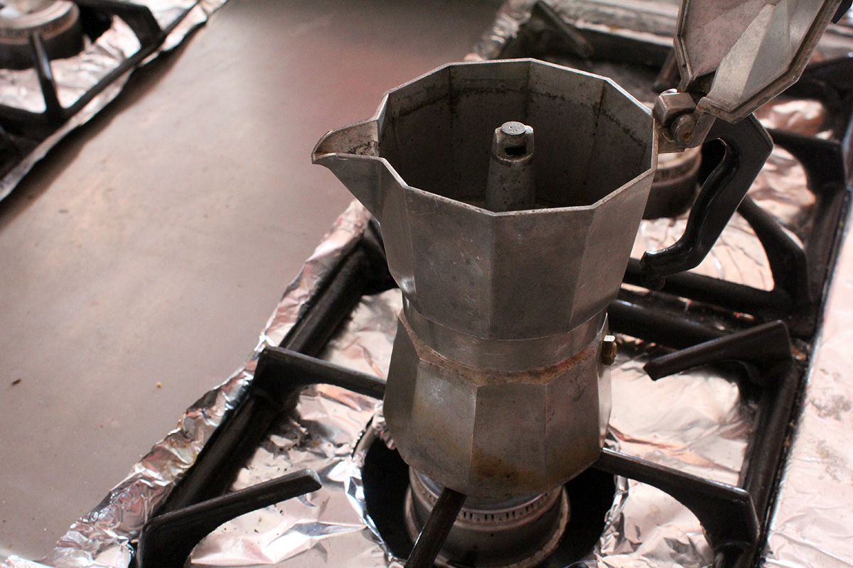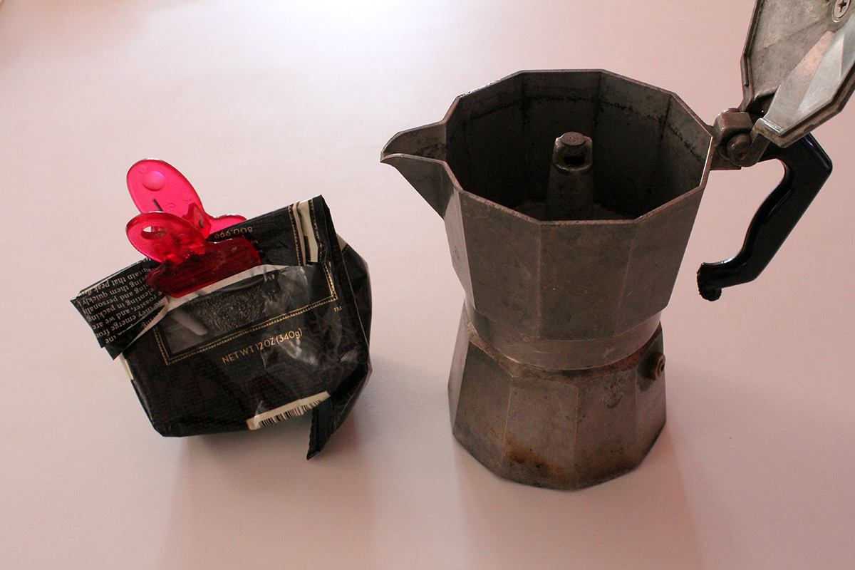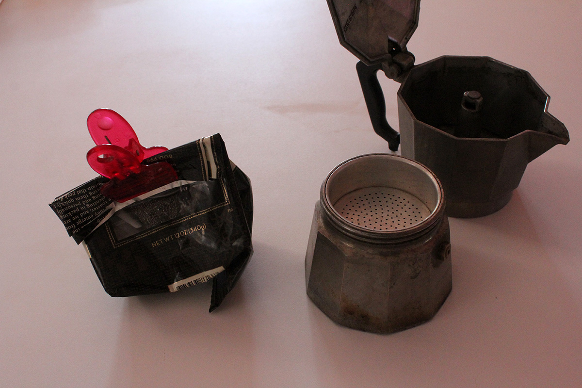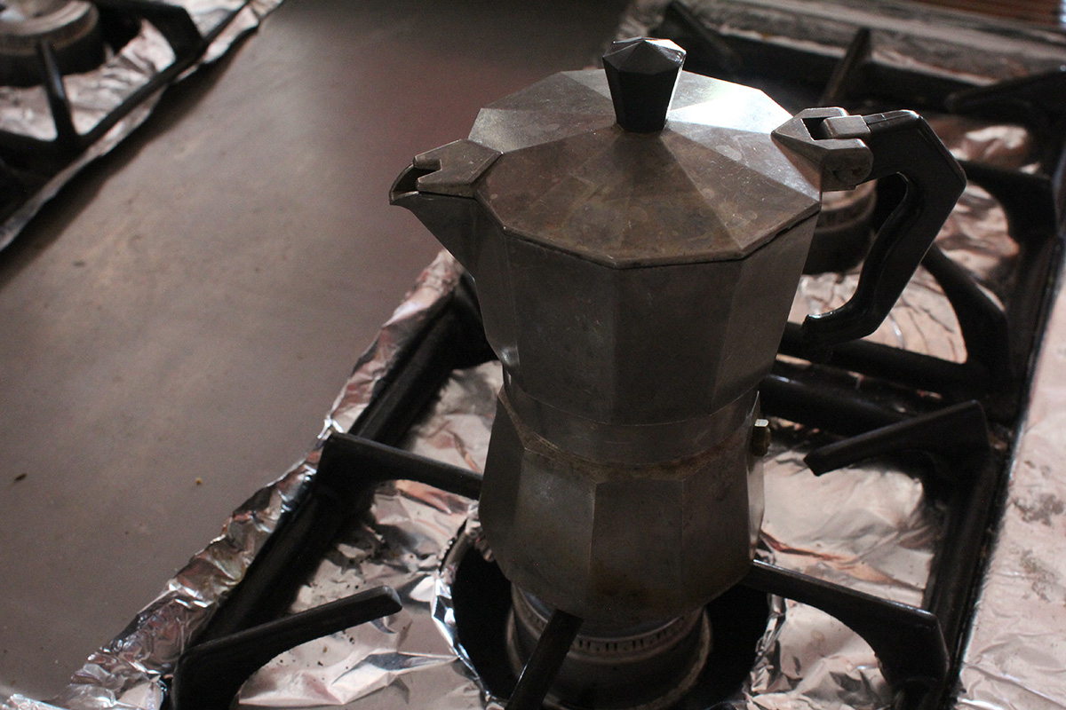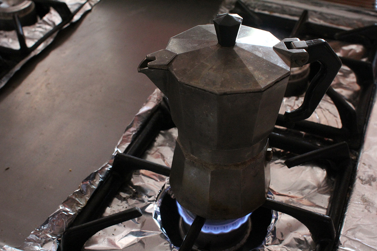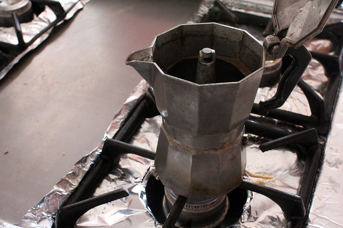 i woke up feeling a little dizzy for some reason, and was hoping maybe the coffee might make it better. i brewed my first cup using the moka pot. i read a bunch of online instructions beforehand and the preferred way seems to be preboiling the water before adding it to the bottom chamber, which i did using my electric kettle. once that happened though, i had to use a towel to hold the base as it was hot. i put espresso coffee ground into the basket, assembled the moka, and set it on the gas stove, adjusting the flames just wide enough so it didn't spill out beyond edge of the top chamber. since the water was preboiled, it brewed the coffee fairly quickly. once i heard something, i opened the lid to find coffee sputtering out of the stem in the upper chamber.
